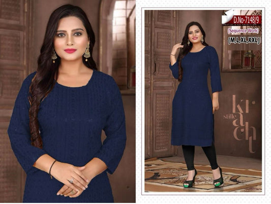 Women Navy Blue Embroidered with Sequence Chikankari Straight Kurta