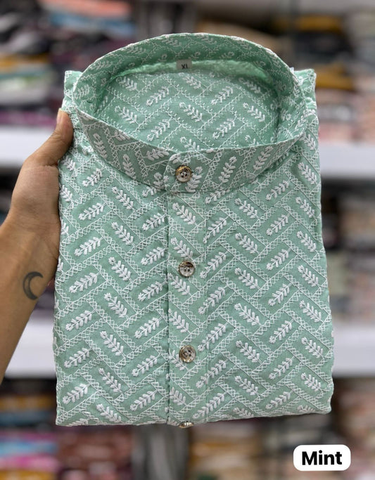 Men's Kurta Churidar with chicken schiffli Cotton Rayon Mint color