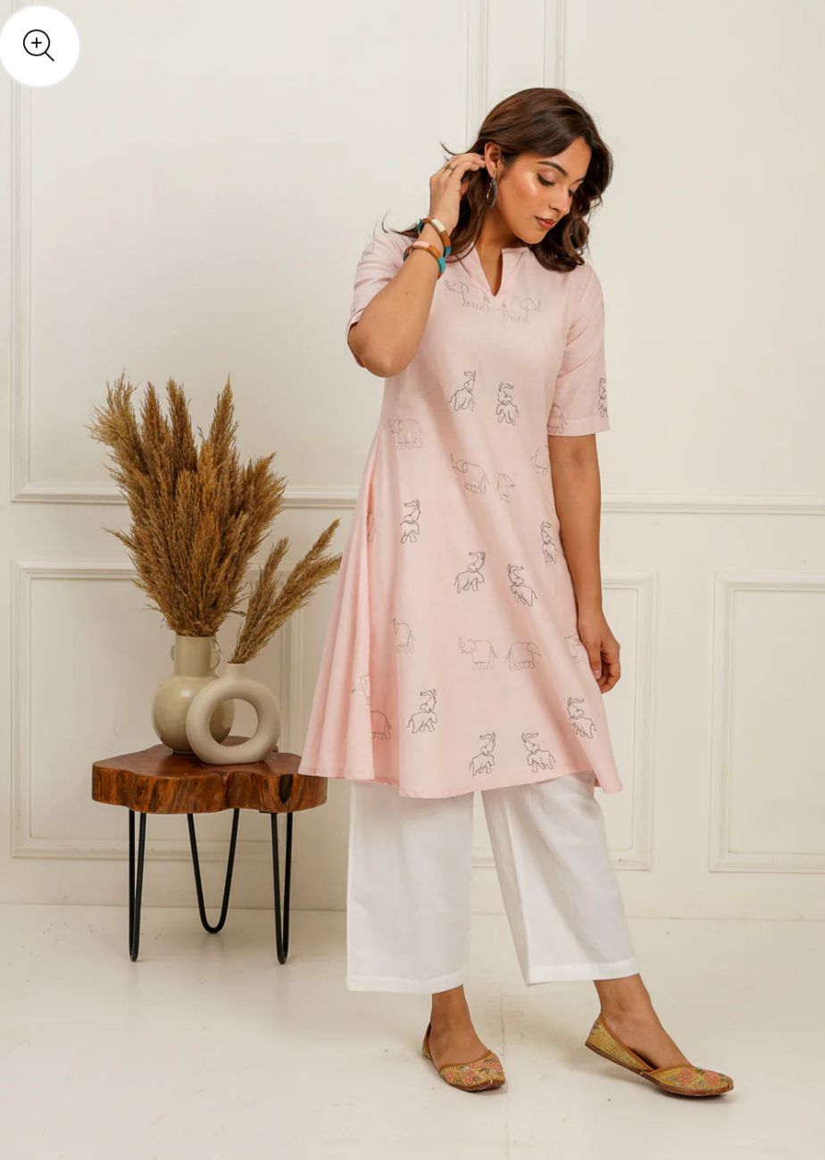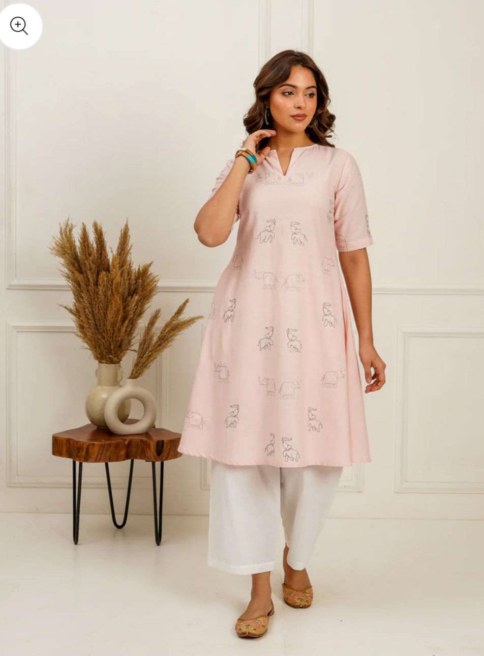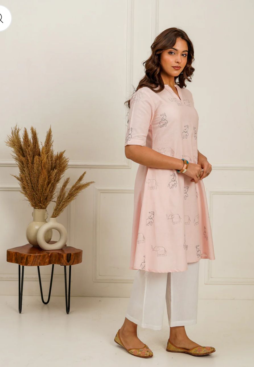This A-line kurti is a beautiful and unique piece that combines classic design elements with interesting details. The combination of the flattering A-line silhouette, side pleats for comfort, and the eye-catching elephant zari embroidery creates a look that is both stylish and culturally inspired.