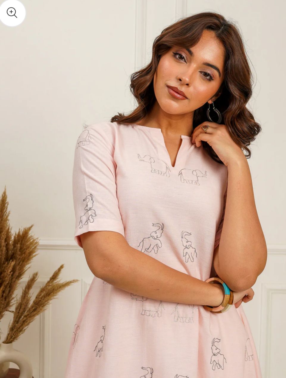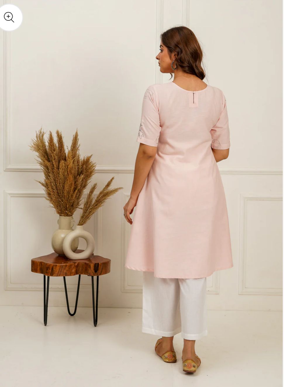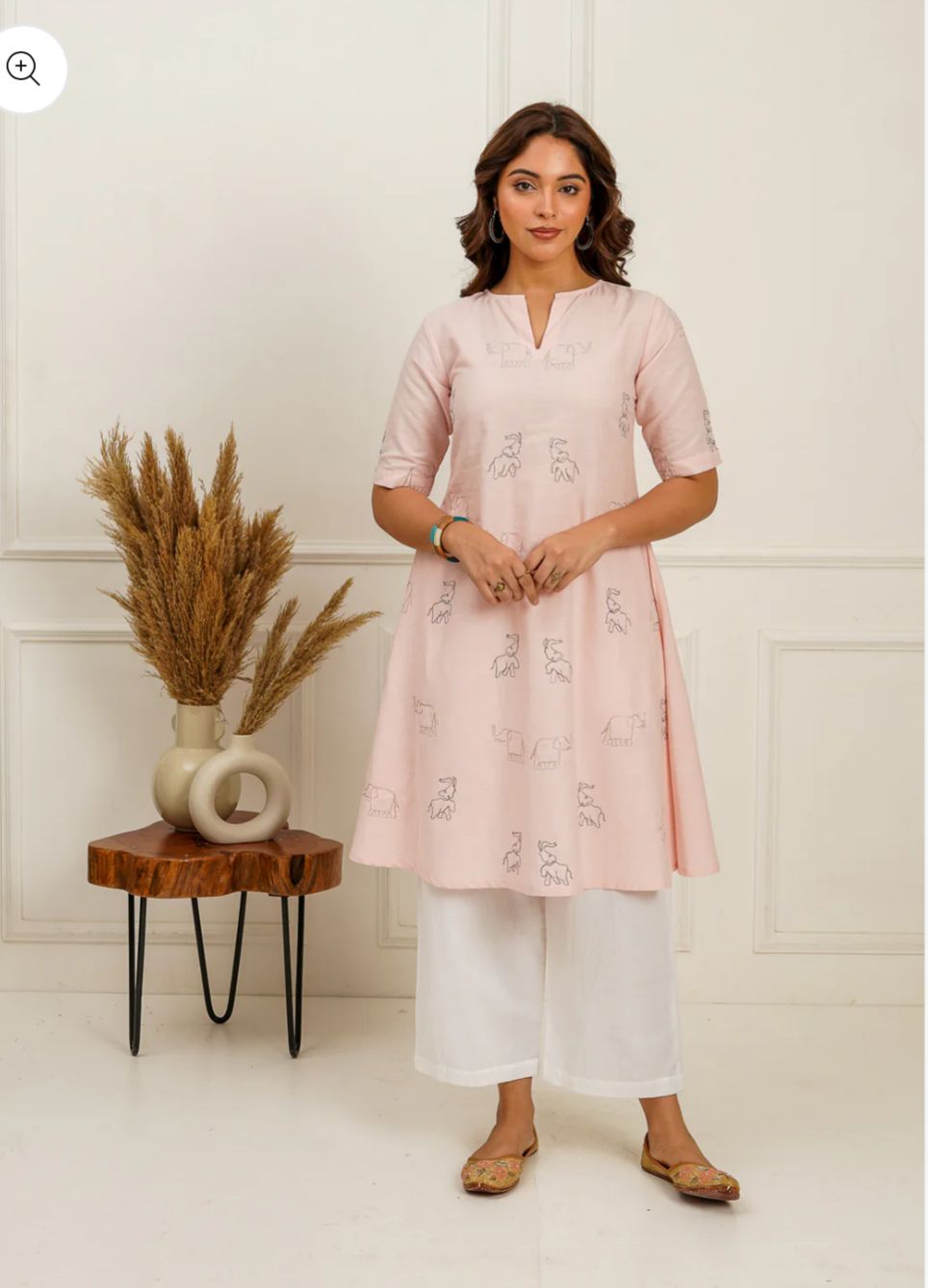 This A-line kurti is a beautiful and unique piece that combines classic design elements with interesting details. The combination of the flattering A-line silhouette, side pleats for comfort, and the eye-catching elephant zari embroidery creates a look that is both stylish and culturally inspired.