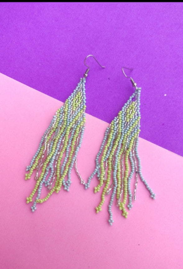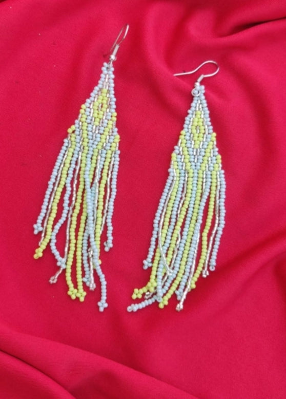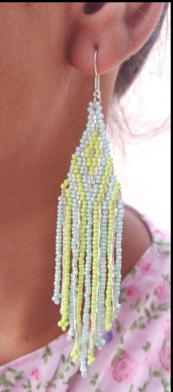 Neon yellow long beaded earrings, feather beaded earrings, neon colors earrings, Southwestern style earrings, jewelry gift, party earrings