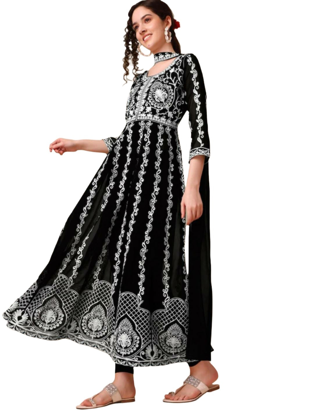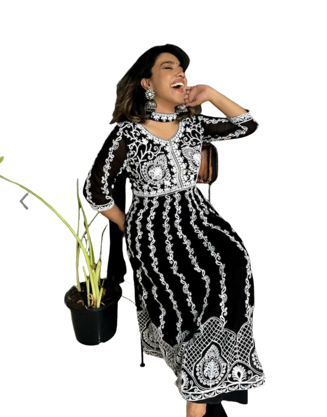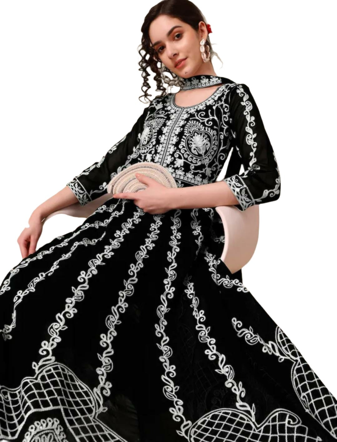 Schwarze Lucknowi Chikankari bestickte Georgette Anarkali Kurta mit Dupatta