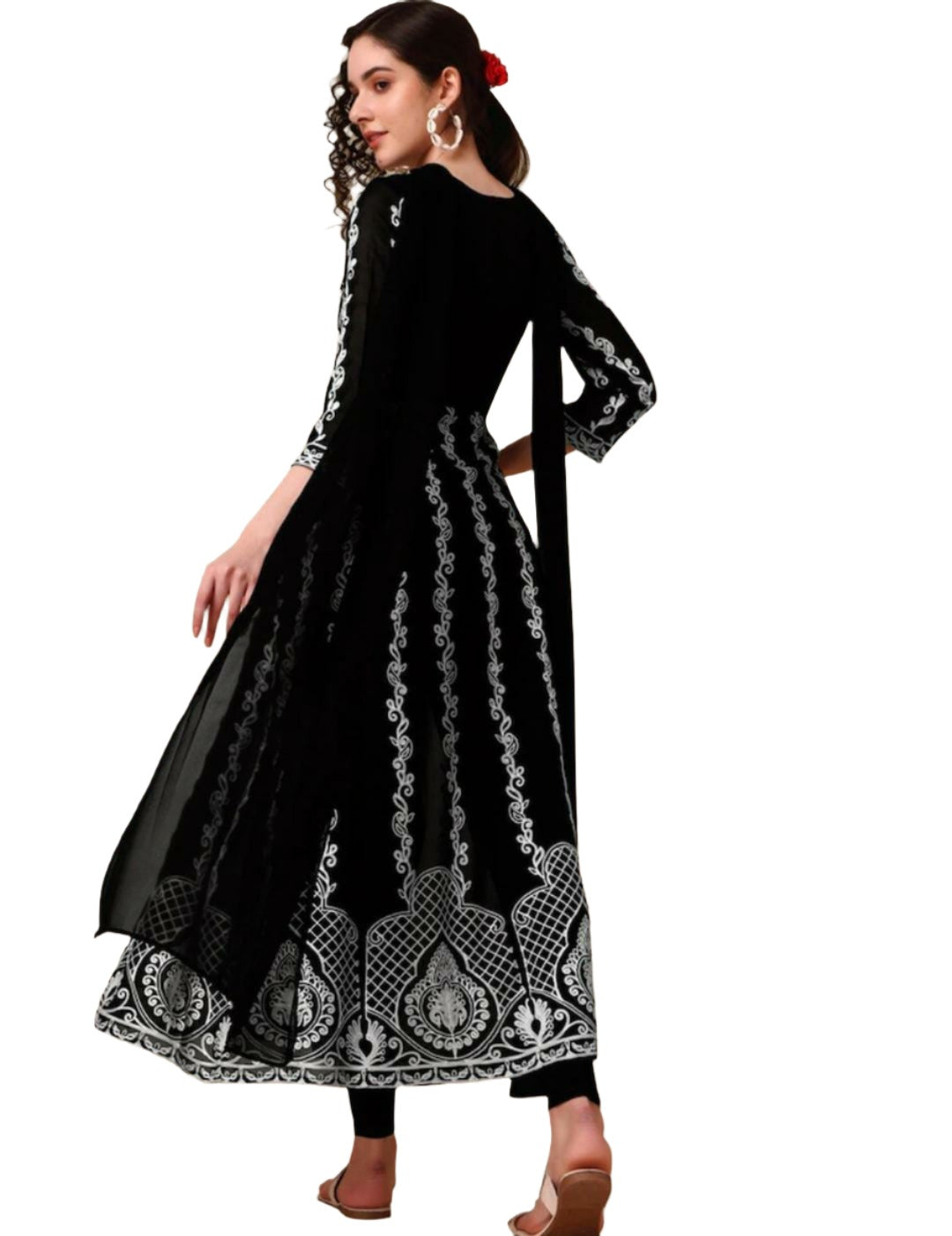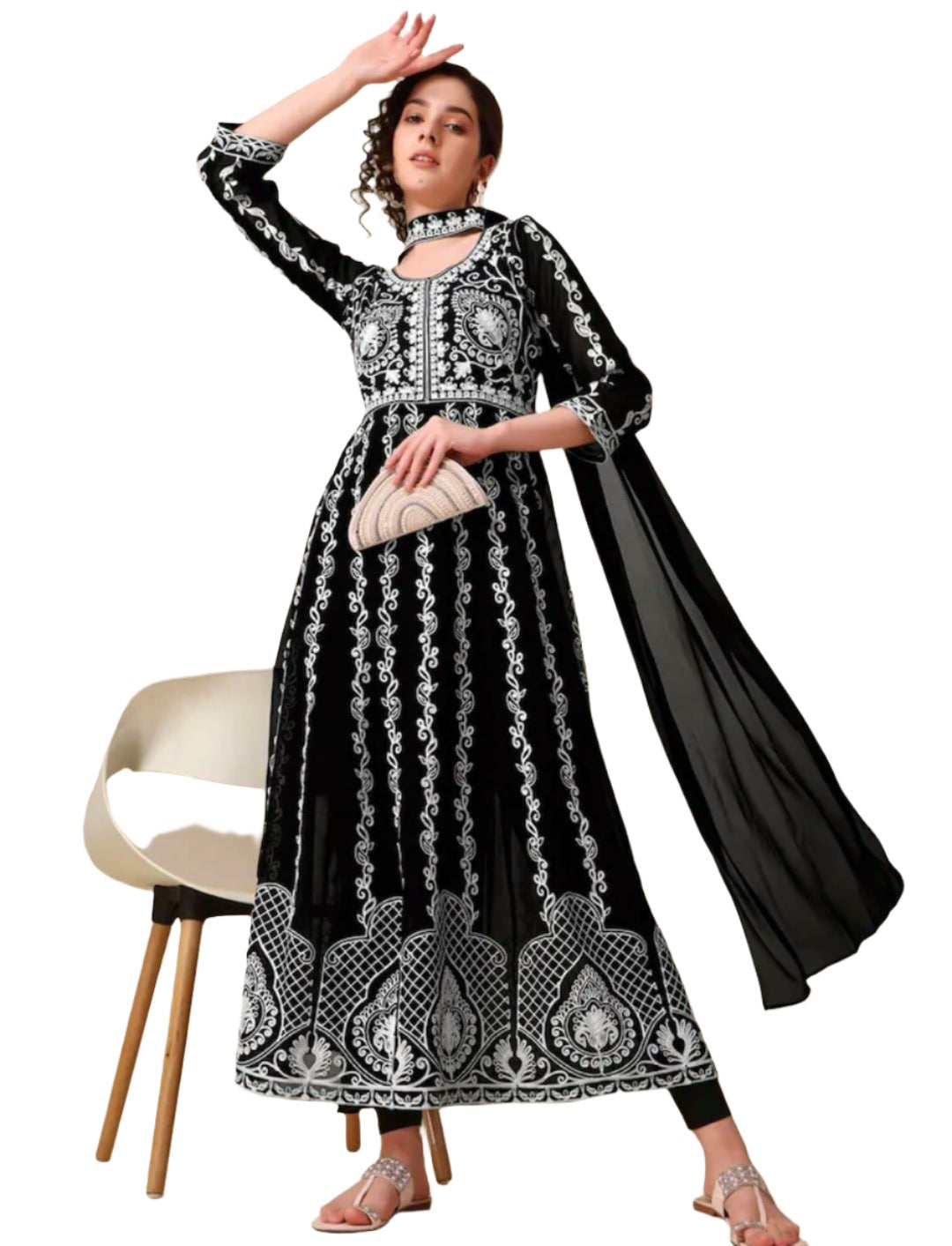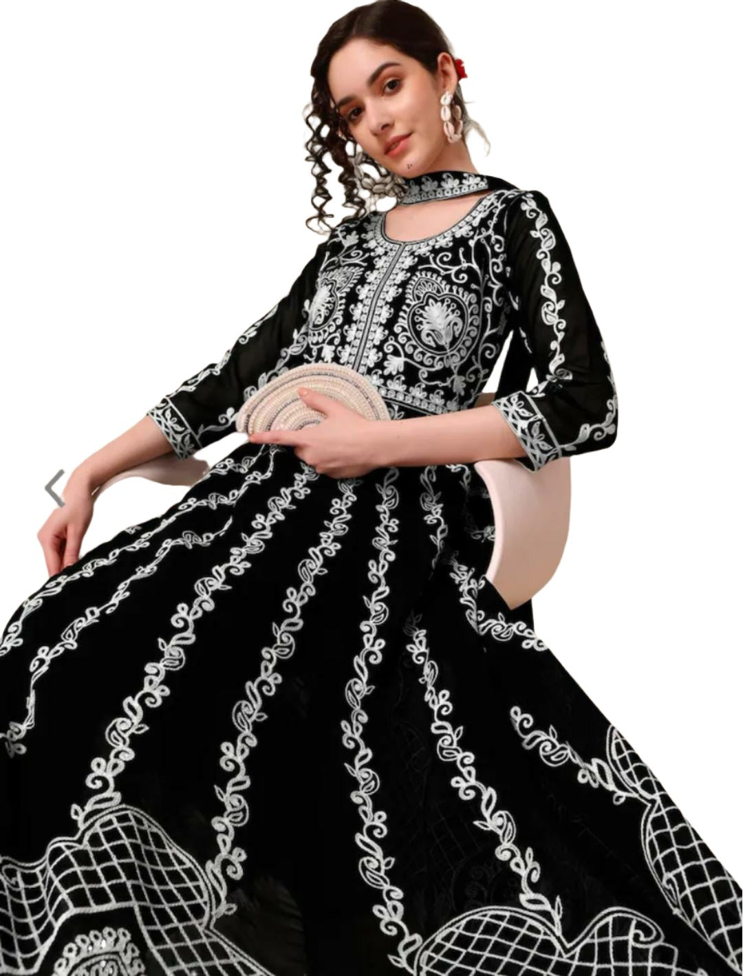 Schwarze Lucknowi Chikankari bestickte Georgette Anarkali Kurta mit Dupatta