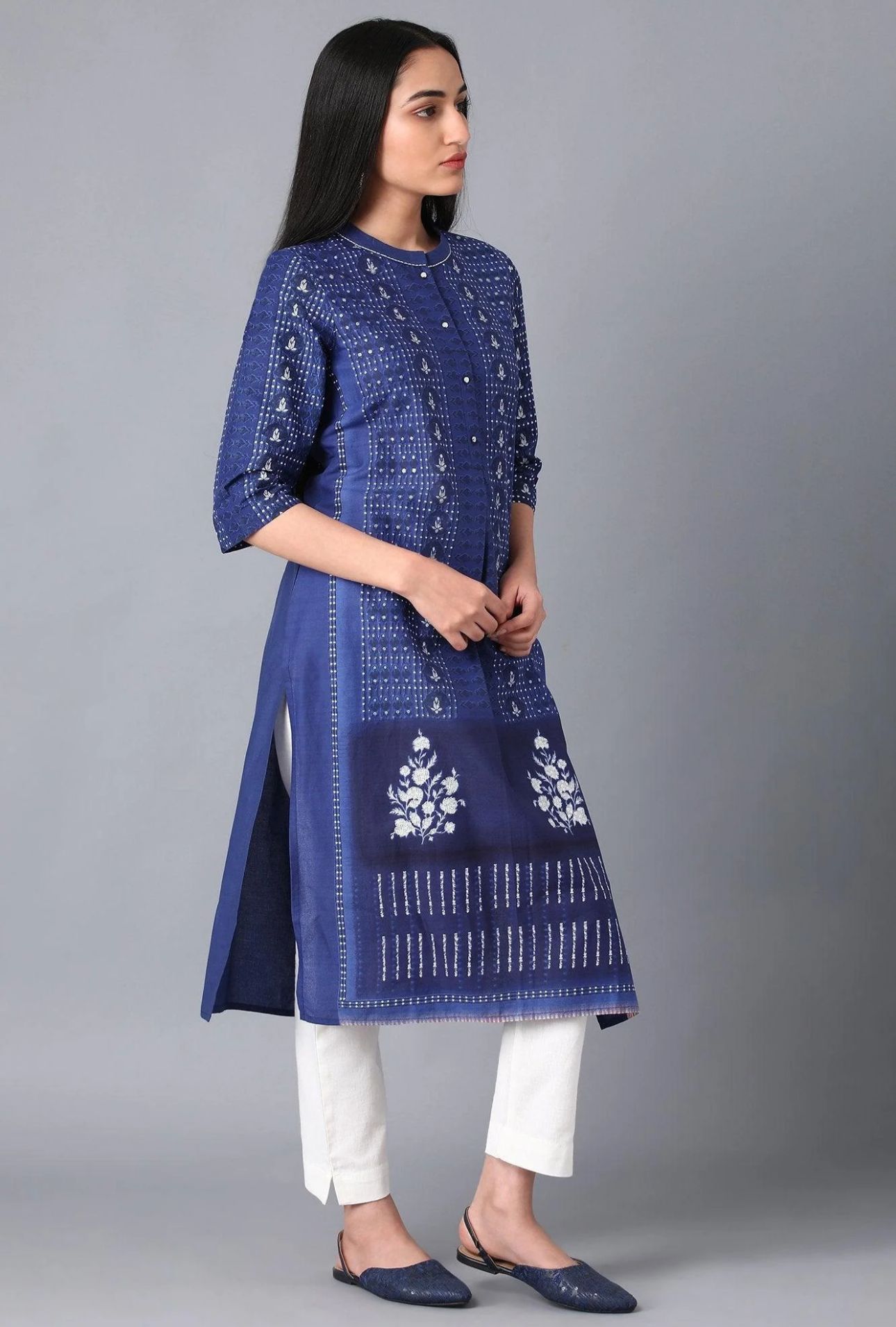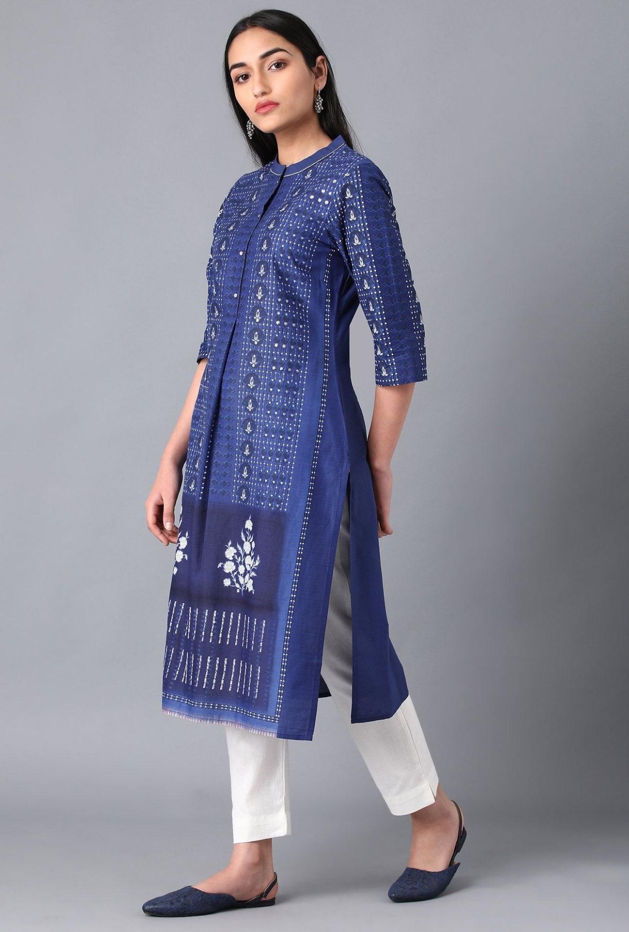 Blue Cotton Printed kurta in Mandarin Collar in Berlin