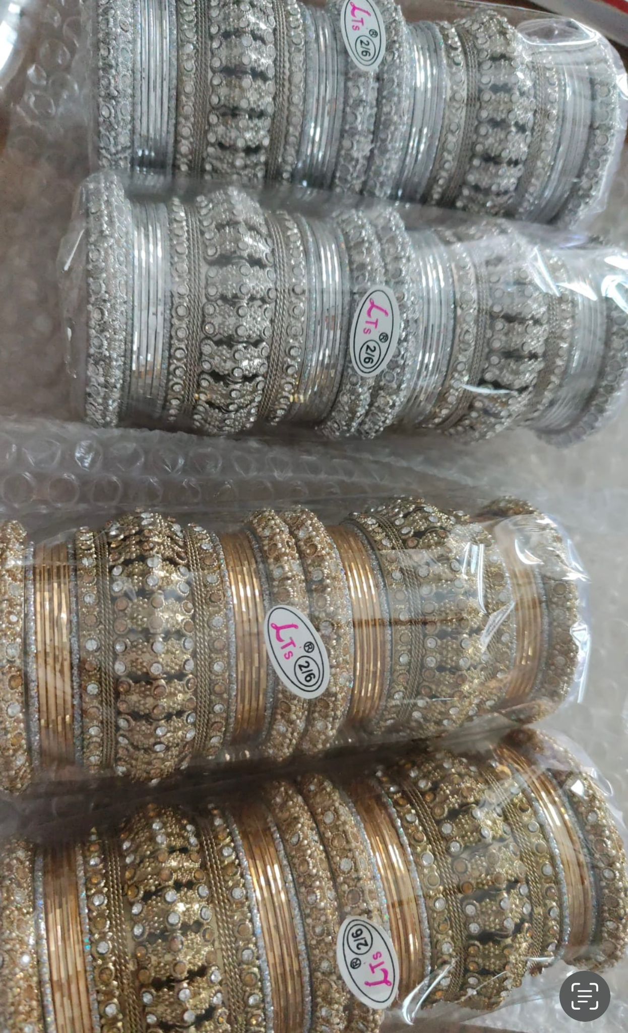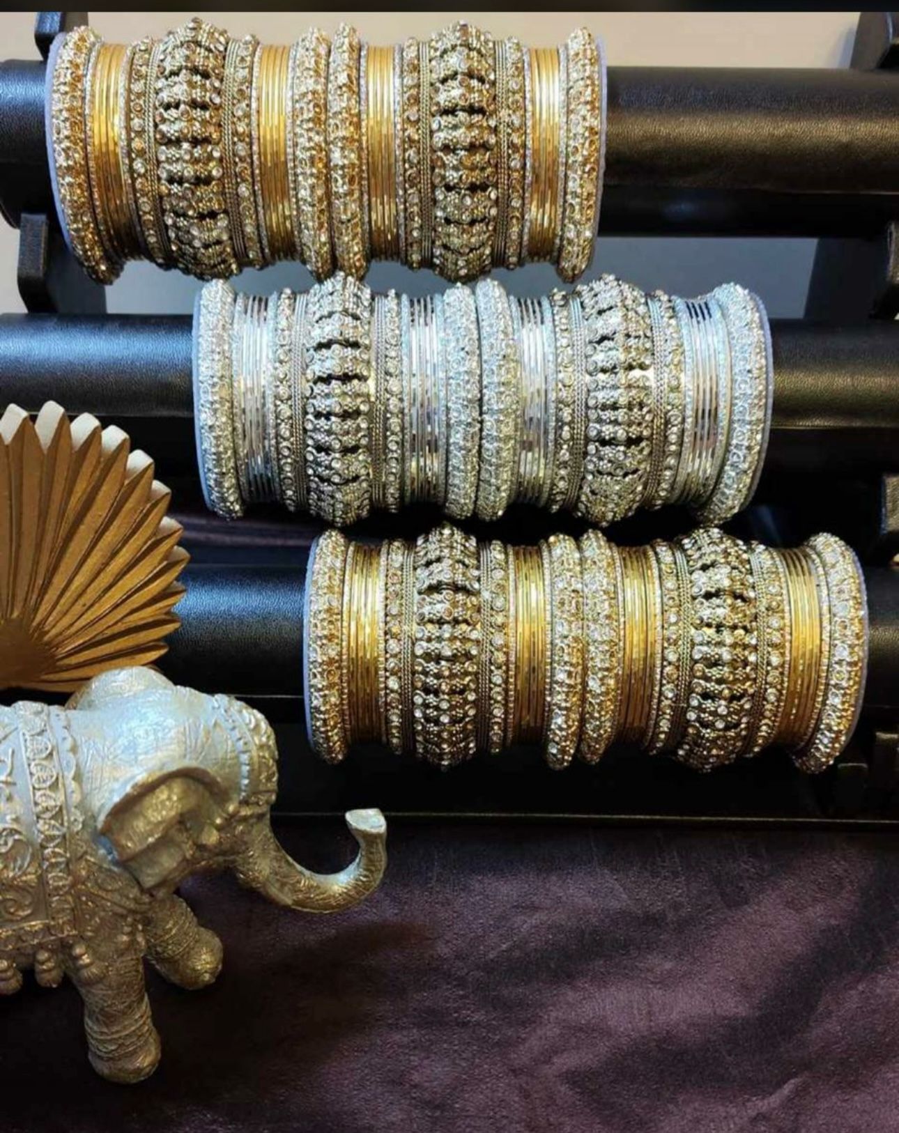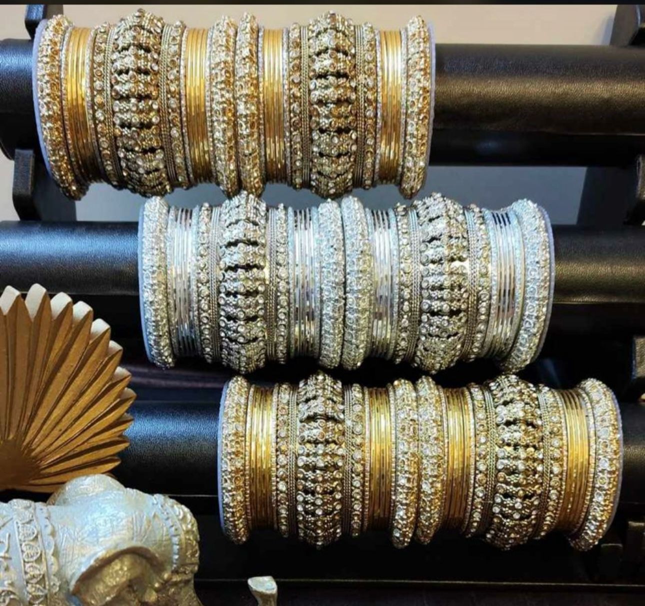Set aus silberner und goldener Partykleidung und Brautarmreifen mit Steinarbeiten. Größe 2,4,2,6,2,8,2,10. Heben Sie sich von der Masse ab mit diesem exklusiven Designer-Armreif-Set von Style India.