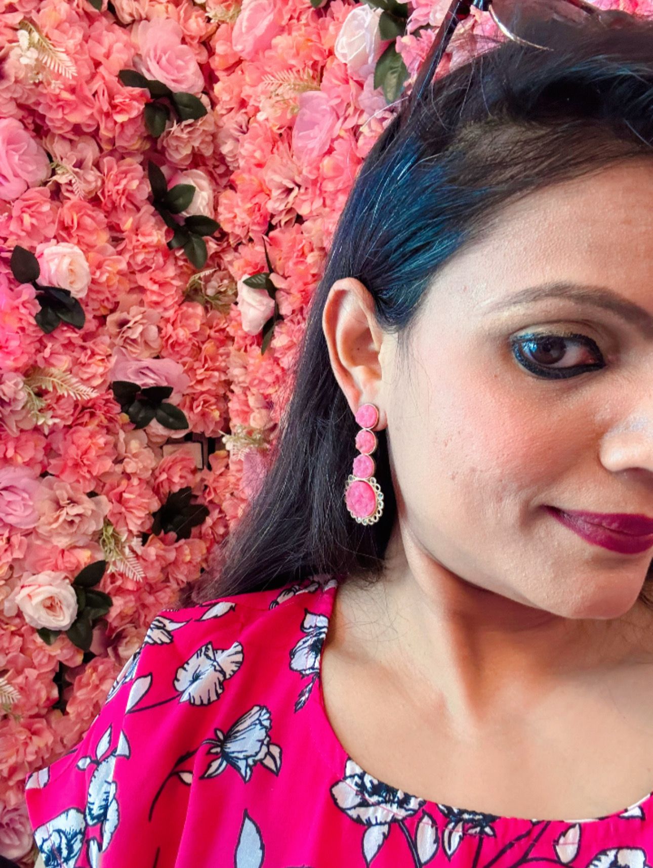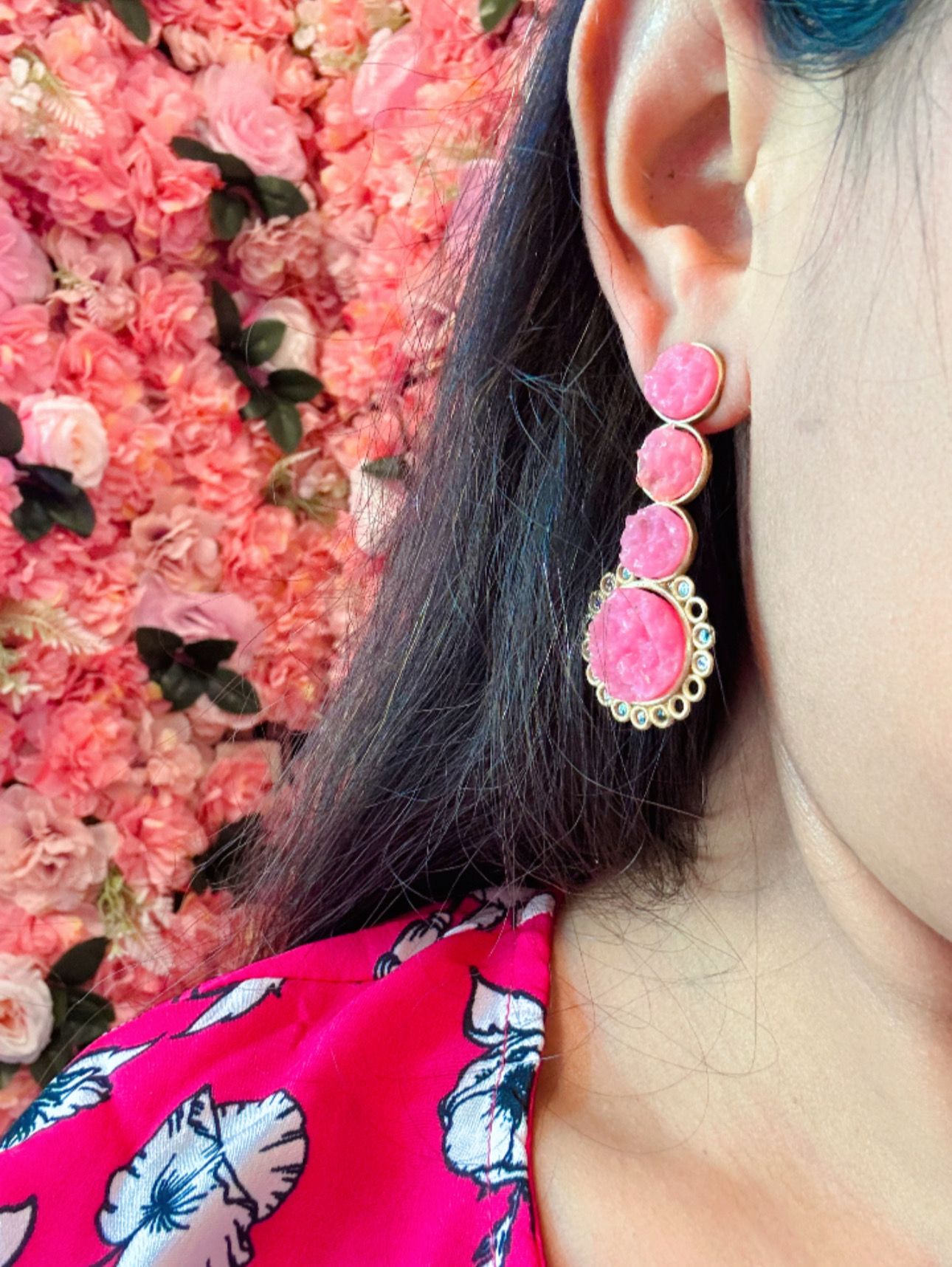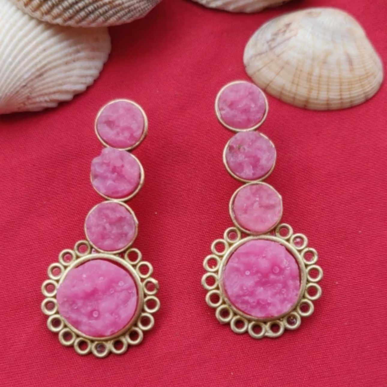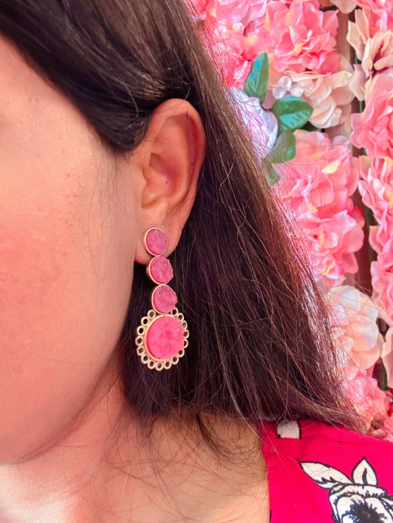 Contemporary Brass Handmade Elegant Pink Druzy Stone Dangle Earrings in Berlin