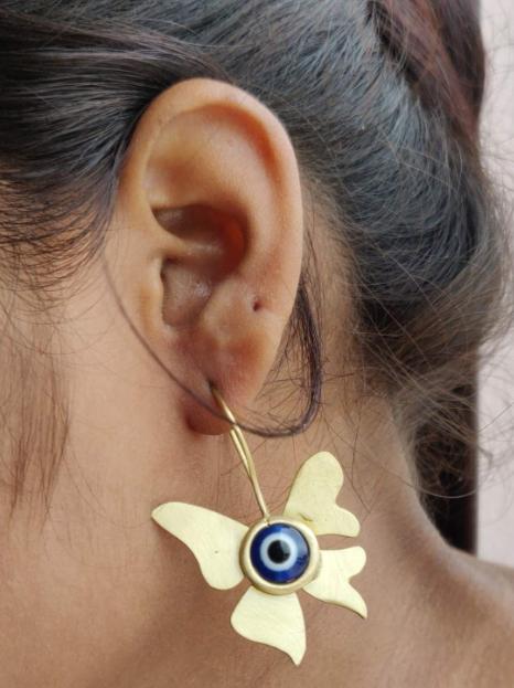 Evil eye stone with butterfly shaped brass earrings in Germany