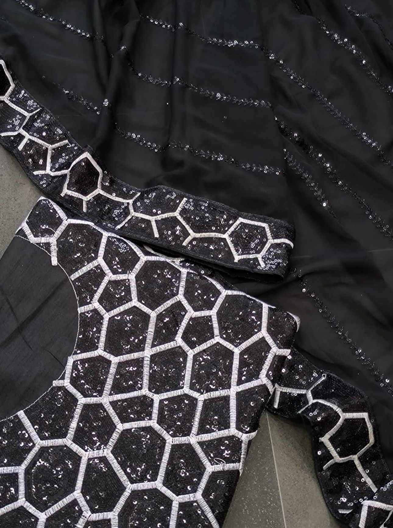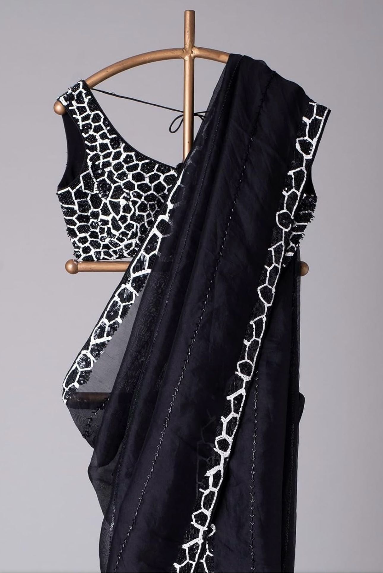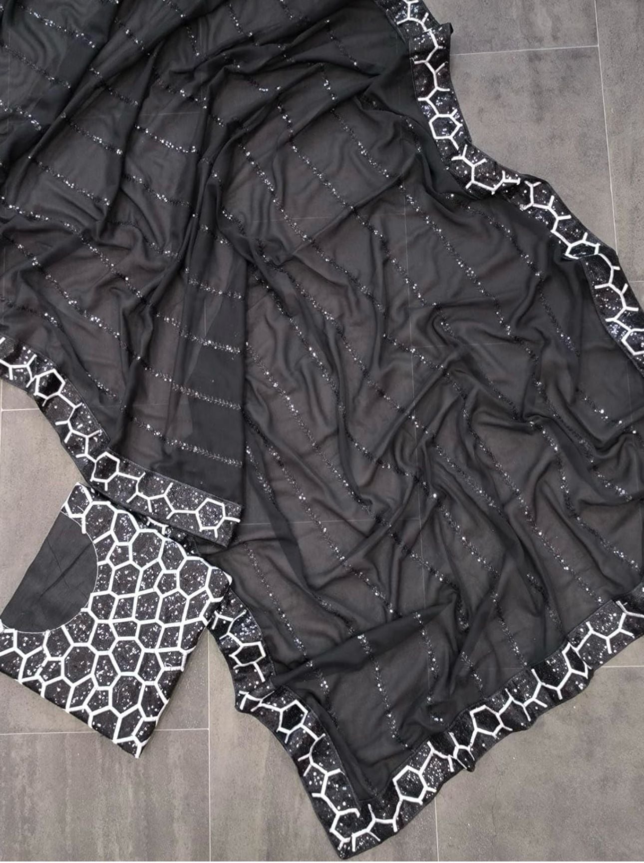 Saree für Damen, weicher, schwerer Georgette-Stoff mit mehrfädiger Reihenfolge und schwarzer Randpaspelierung