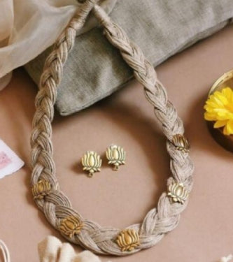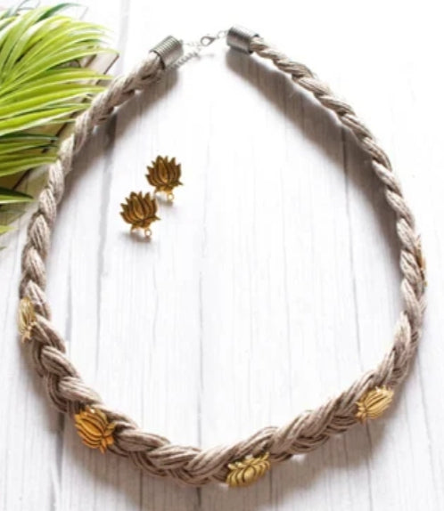 Gold Finish Lotus Metal Charms Hand Braided In Jute Threads Choker Necklace