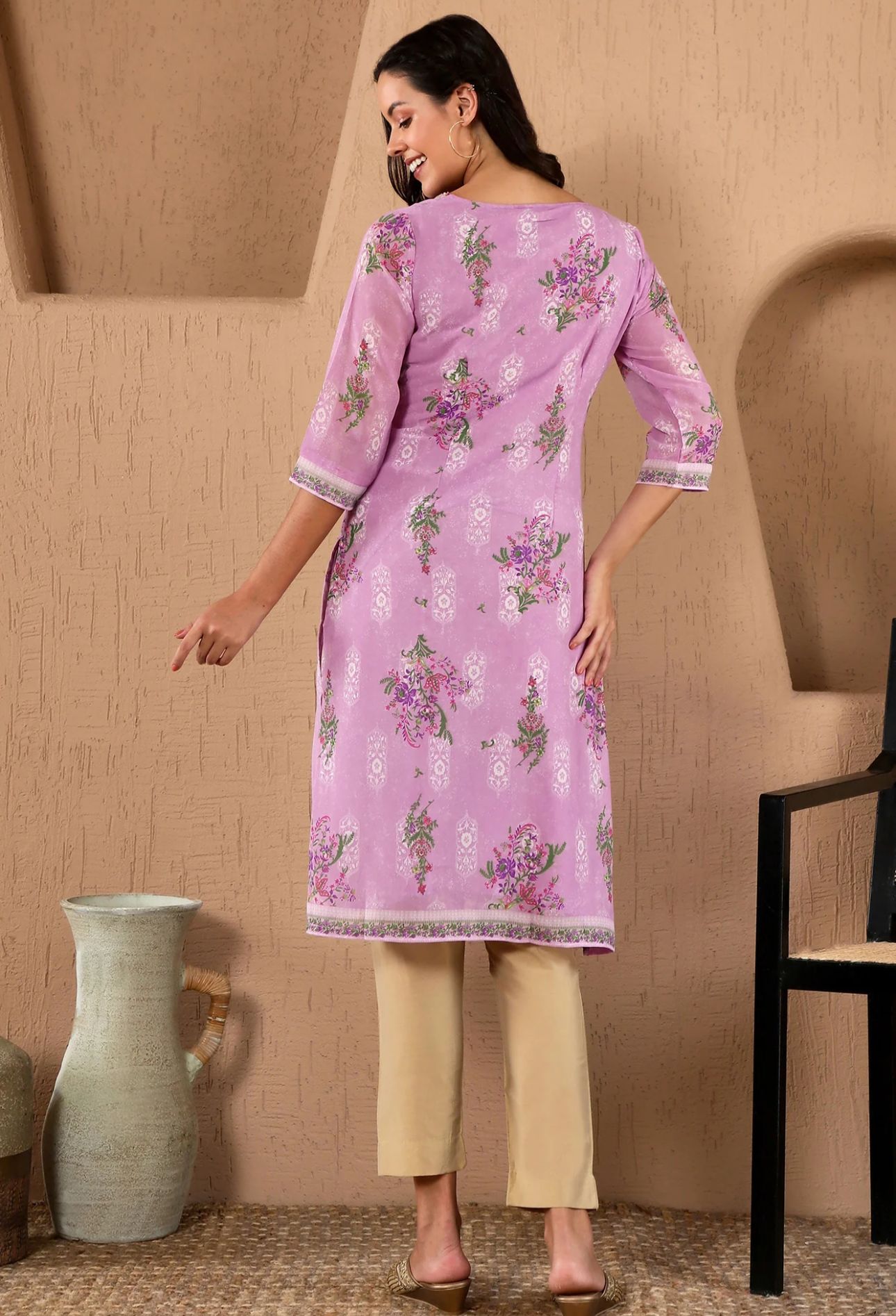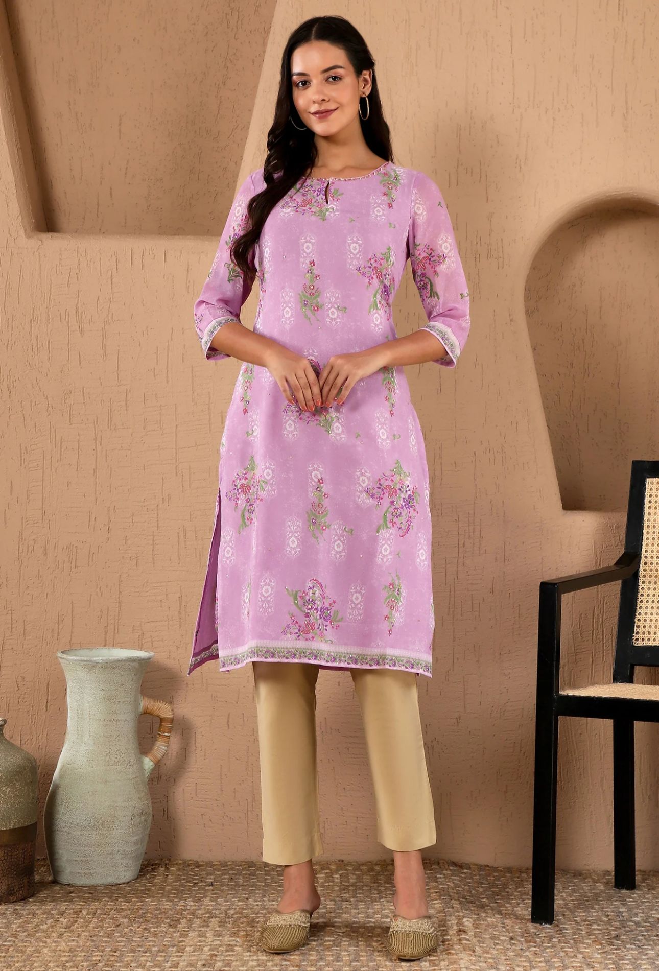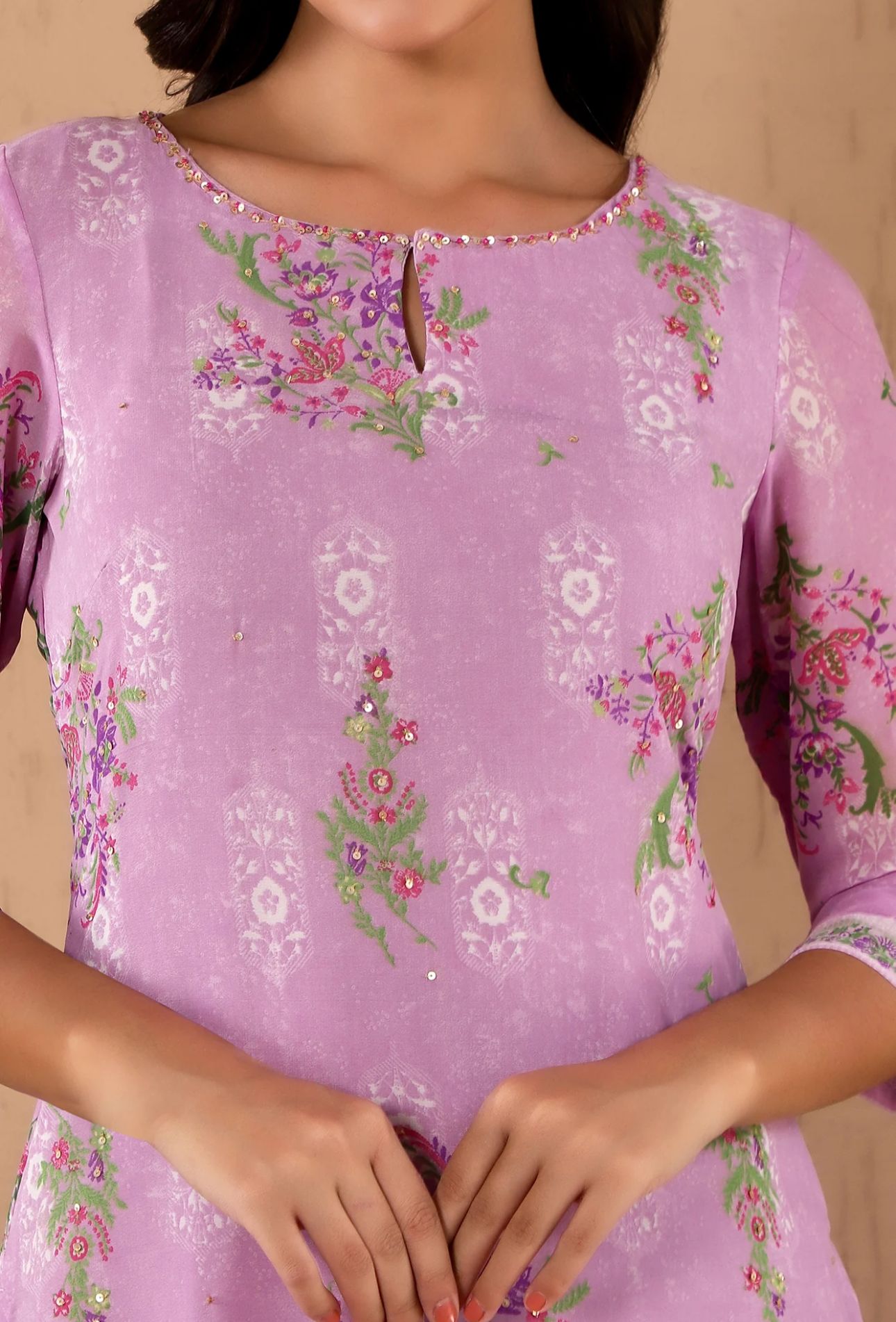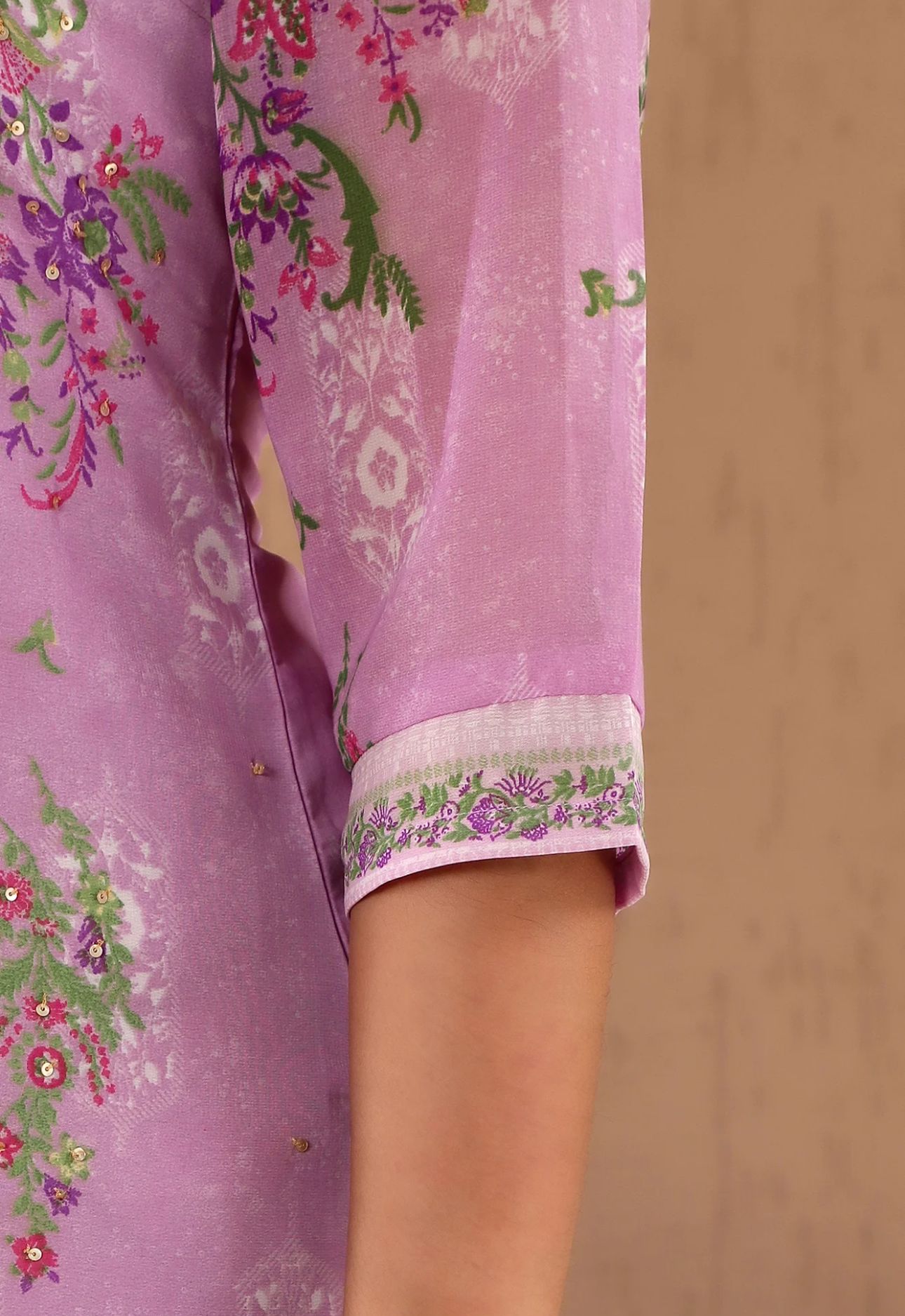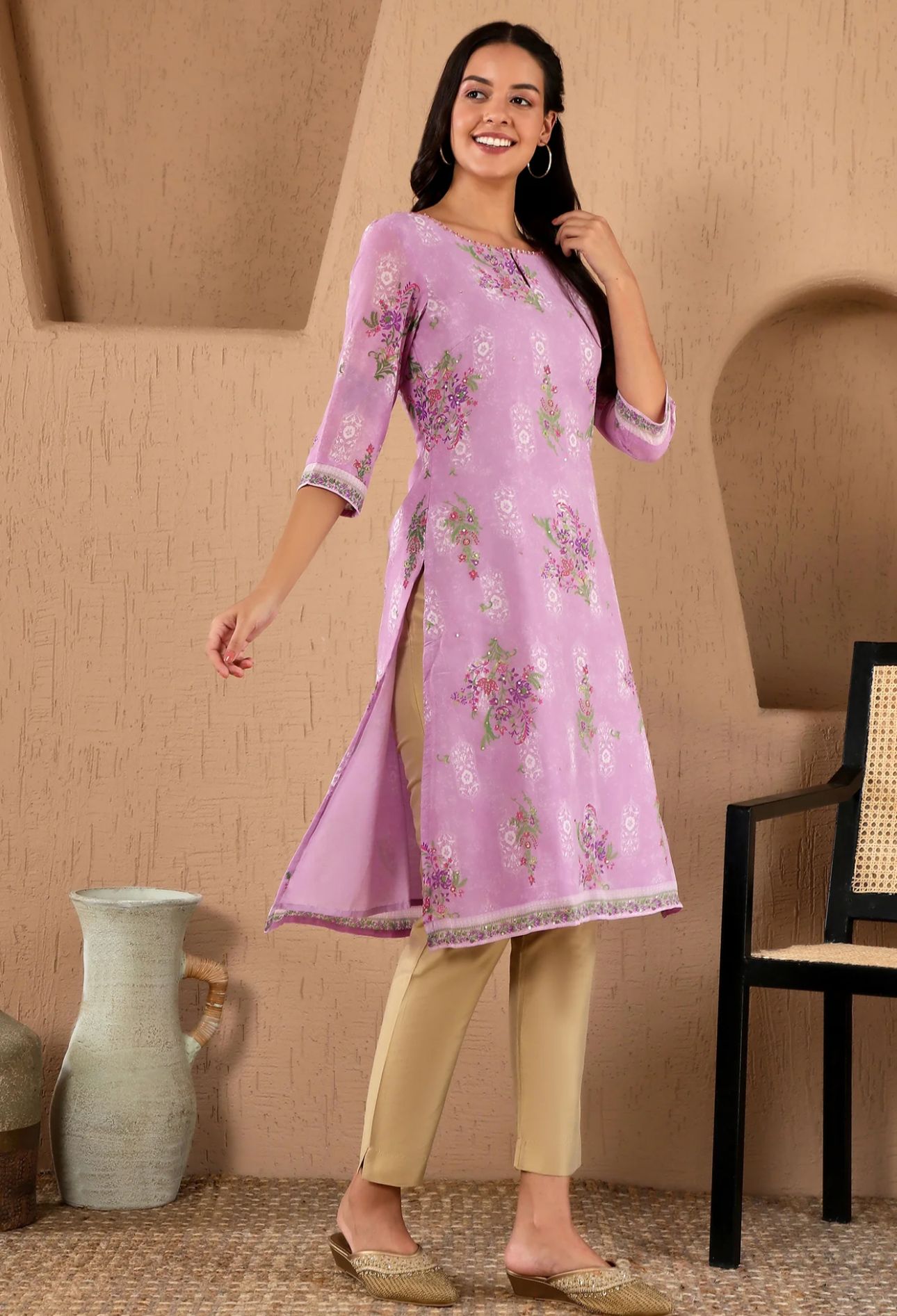 Lavender Floral Printed Metallic Sequined Organza Festive Straight Kurta