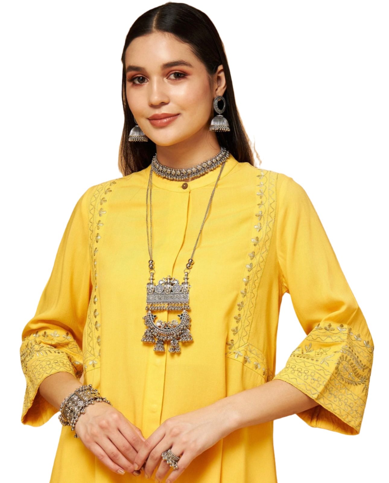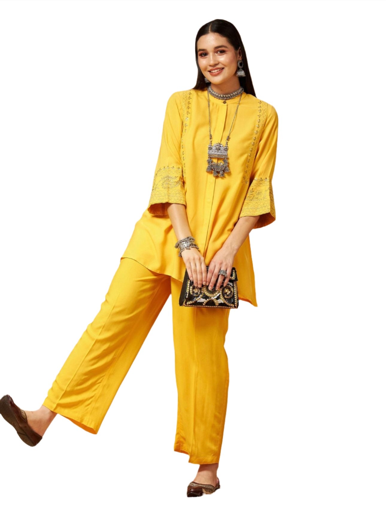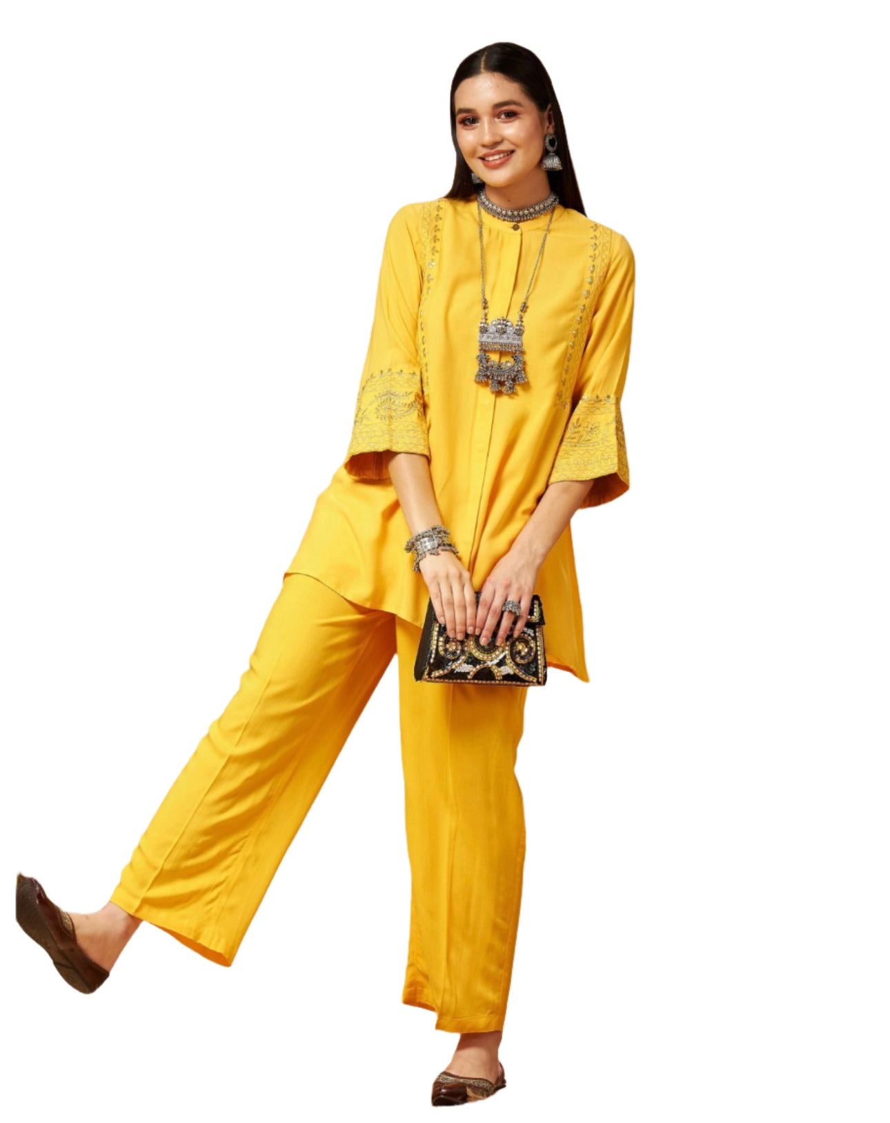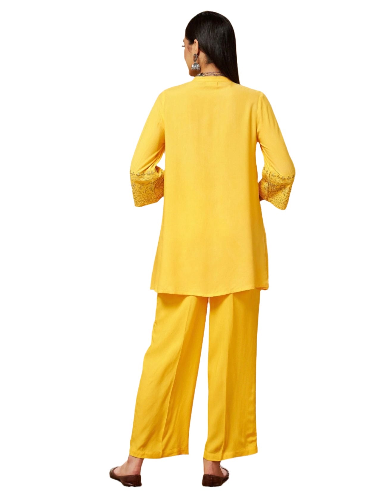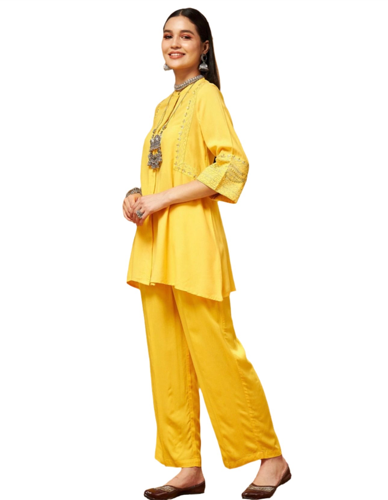 Gelbes, besticktes Oberteil mit Palazzos, aus Viskosestoff, ungefüttert, normale Länge, bequeme Passform, Knopfverschluss, ausgestellter Saum und mit Zari-Stickerei vorne und an der Ärmelöffnung