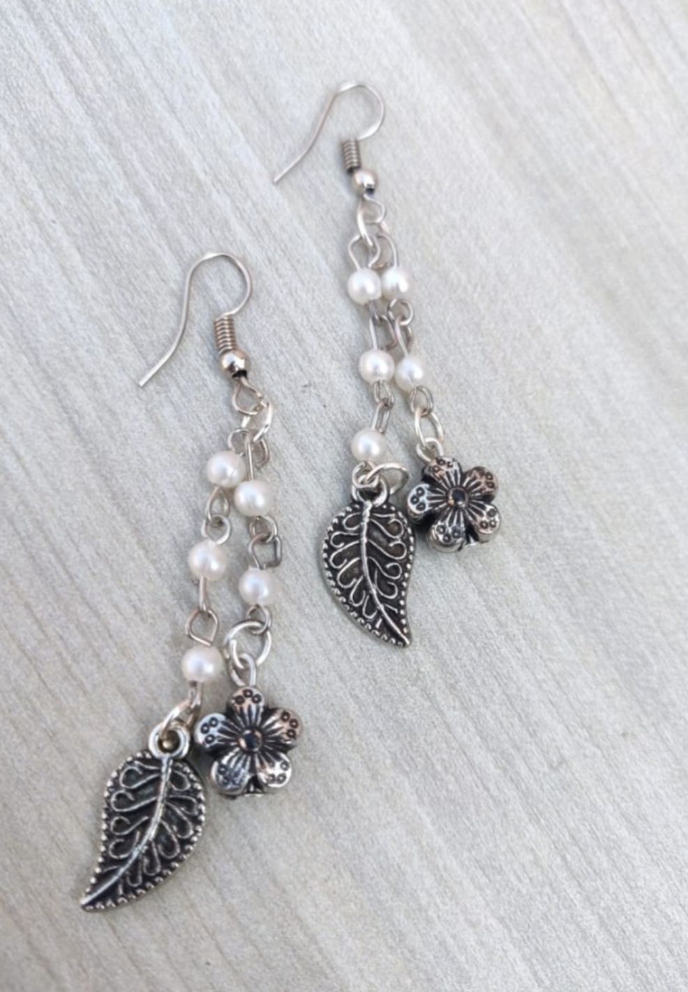Two Layer Pearl Chain with Flower and Leaf Dangler Earrings