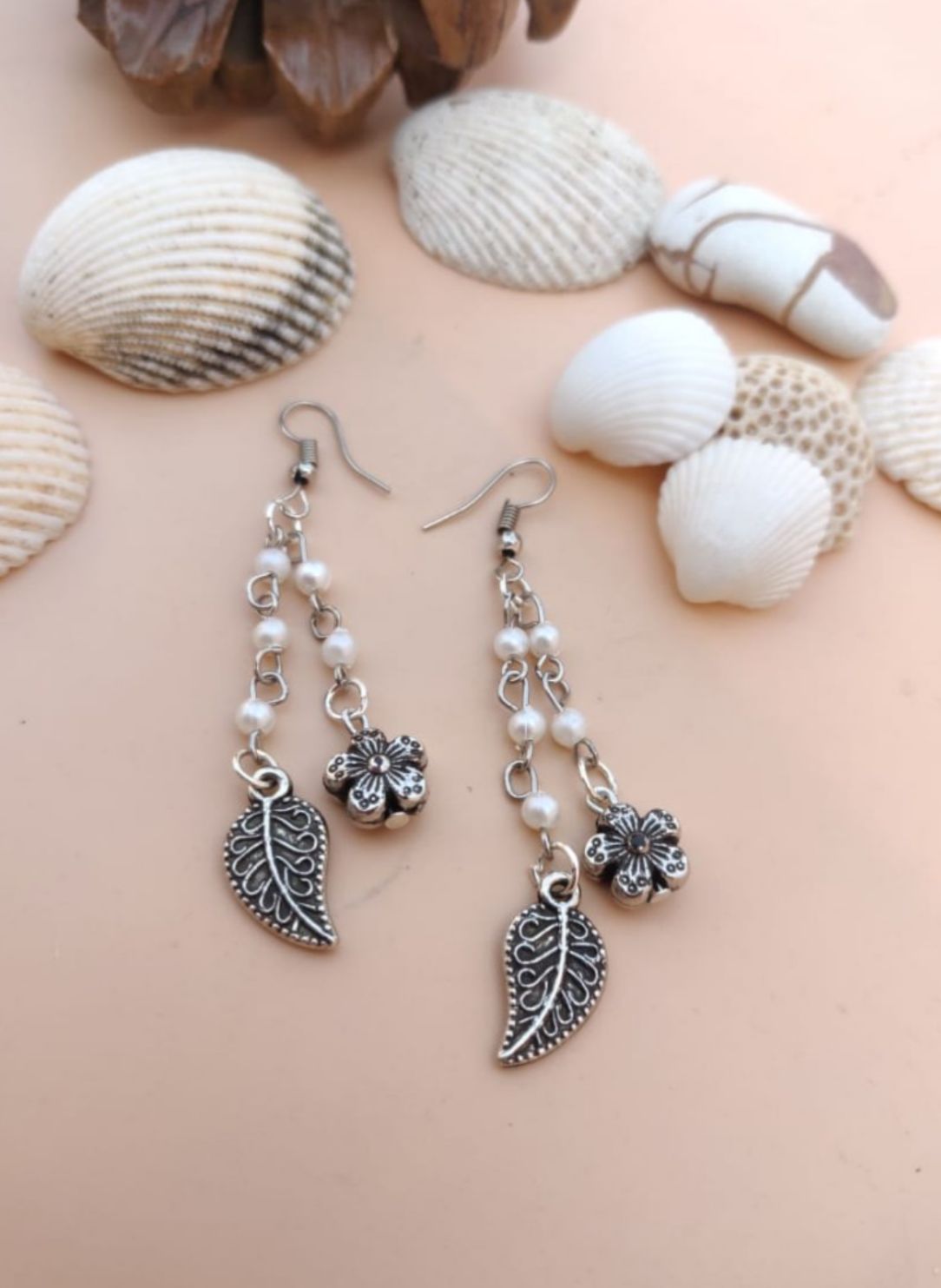 Two Layer Pearl Chain with Flower and Leaf Dangler Earrings in Germany