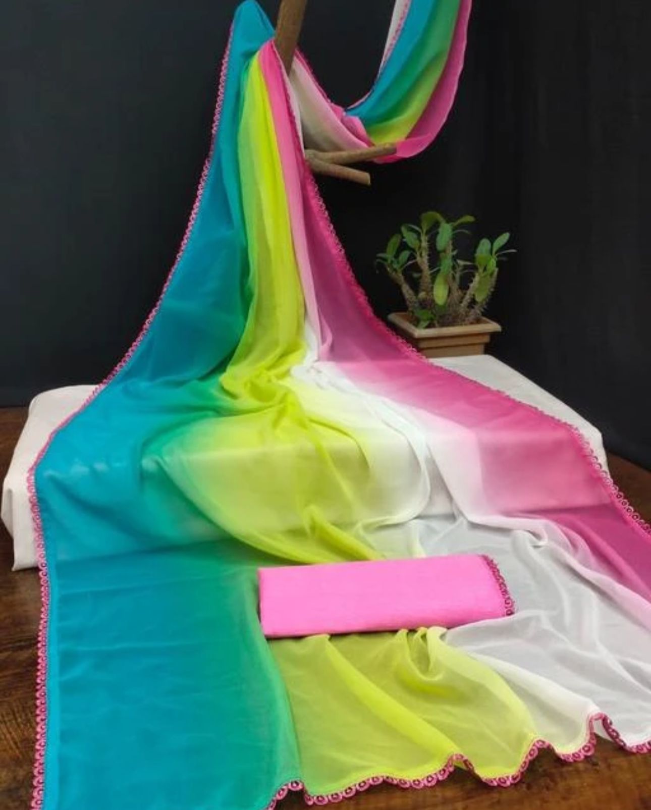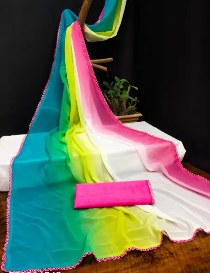 Embrace your inner star with this ALIA BHATT SAREE !This stylish saree features a pure chiffon fabric with an dye and is inspired by the iconic Aalia Bhatt from rocky aur rani ki prem kahani. Add the graceful elegance of a Bollywood actress into your wardrobe with this From elegant designer styles to trending now, this is the perfect way to make a statement!