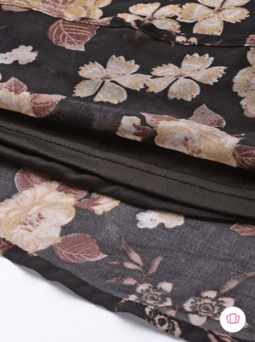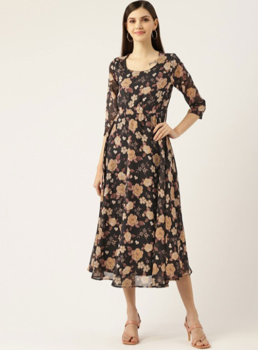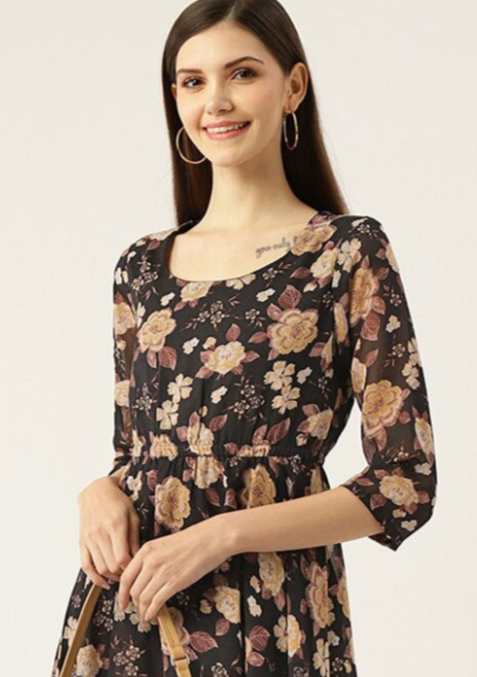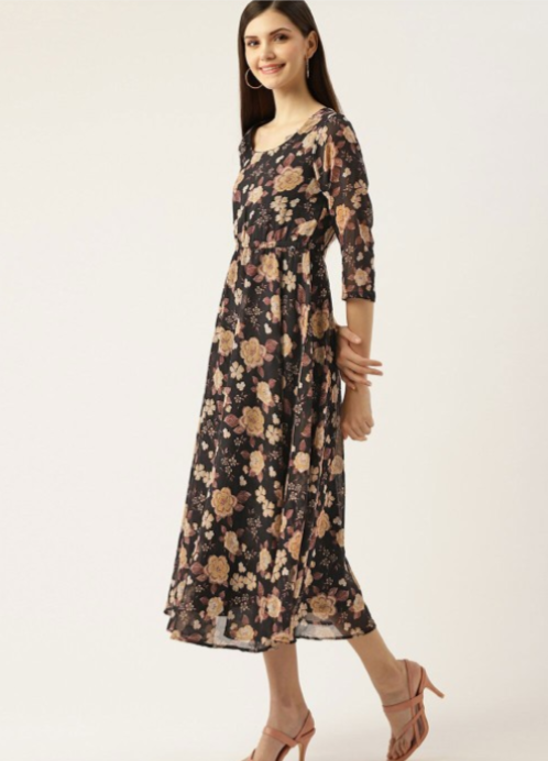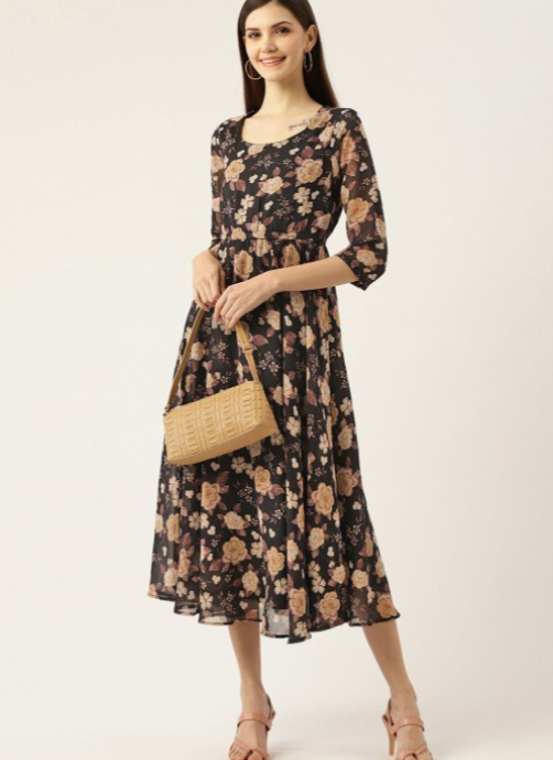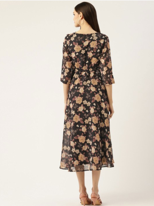 Black Floral Printed Georgette Fit & Flare Midi Dress in Berlin