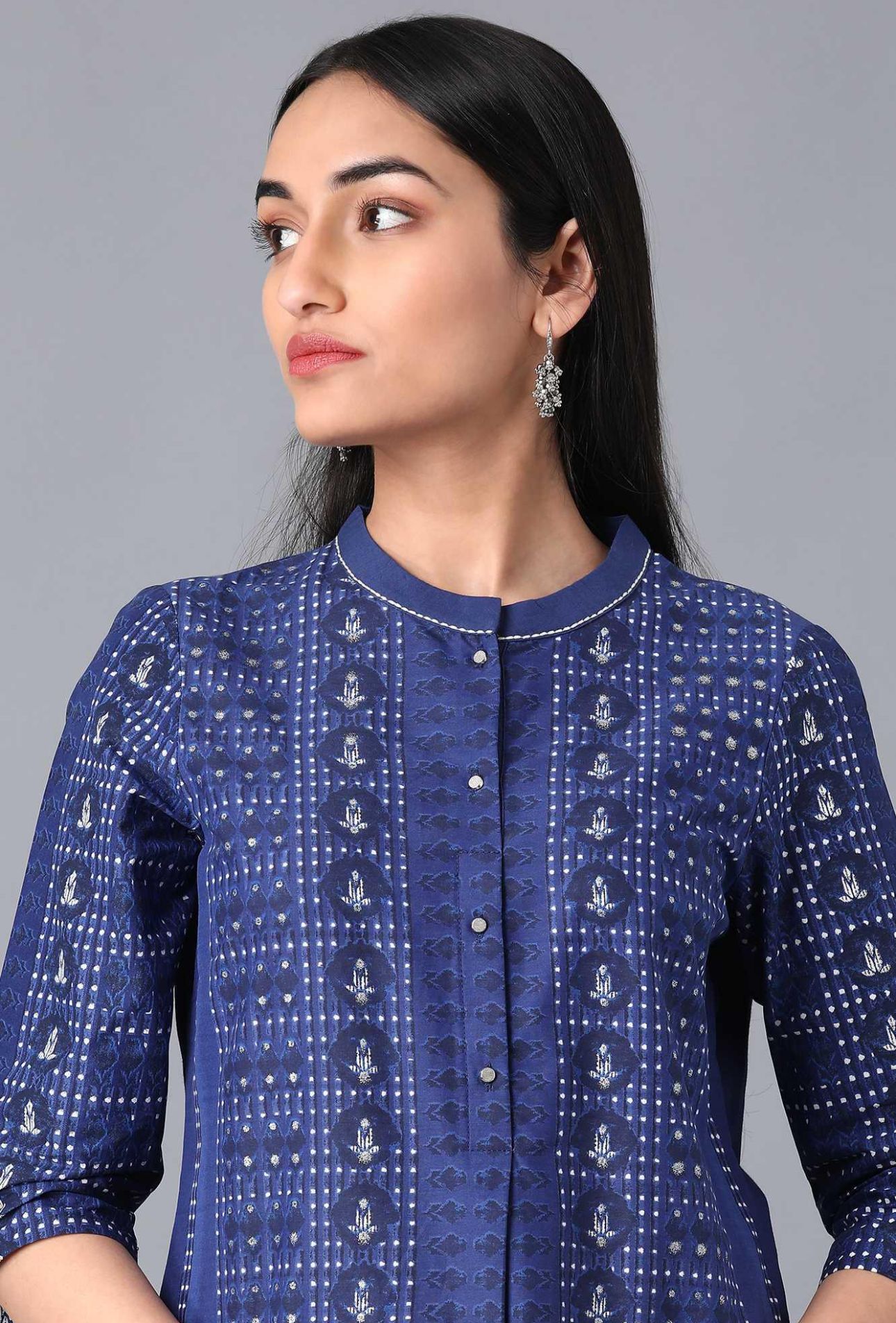 Blue Cotton Printed kurta in Mandarin Collar