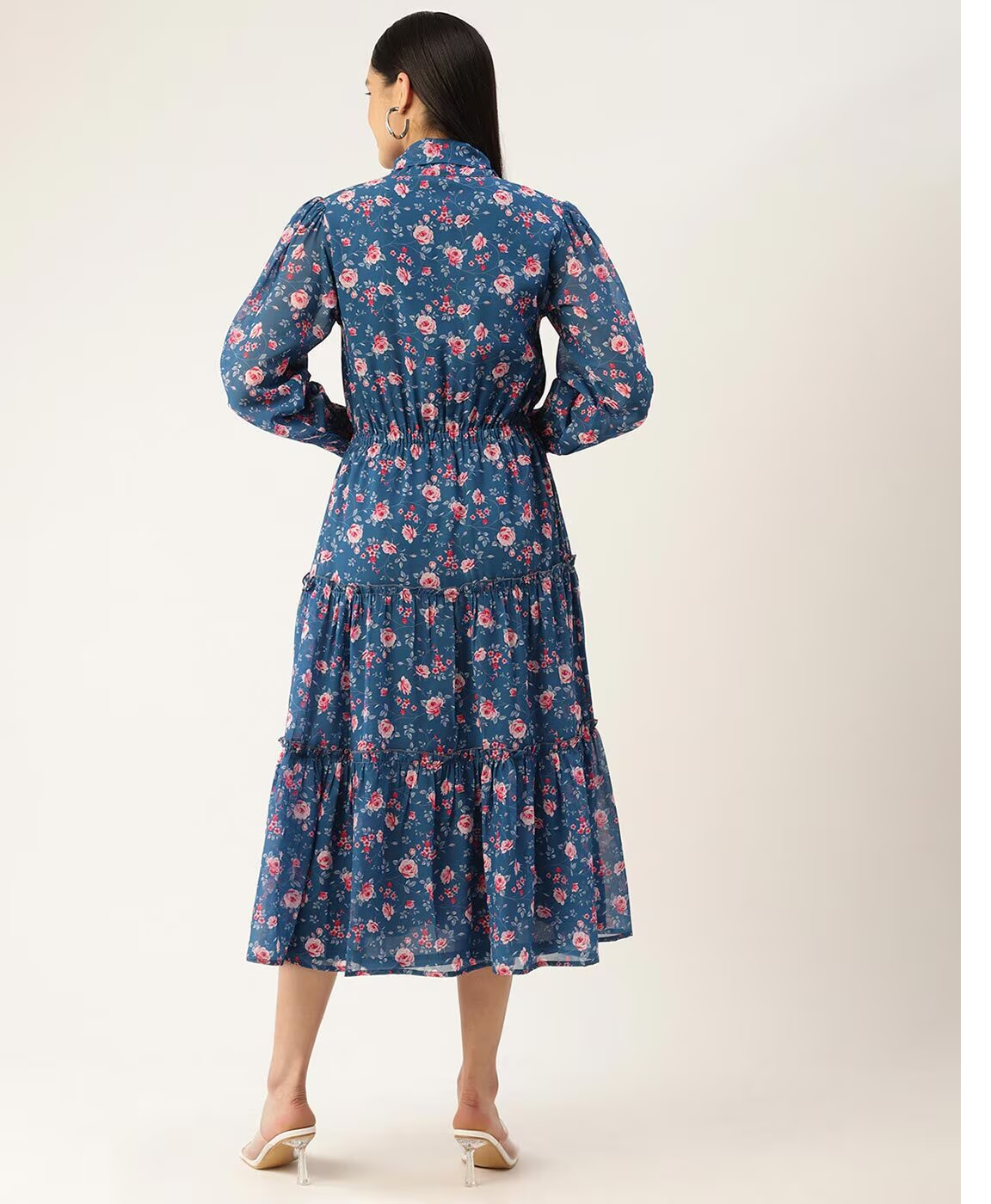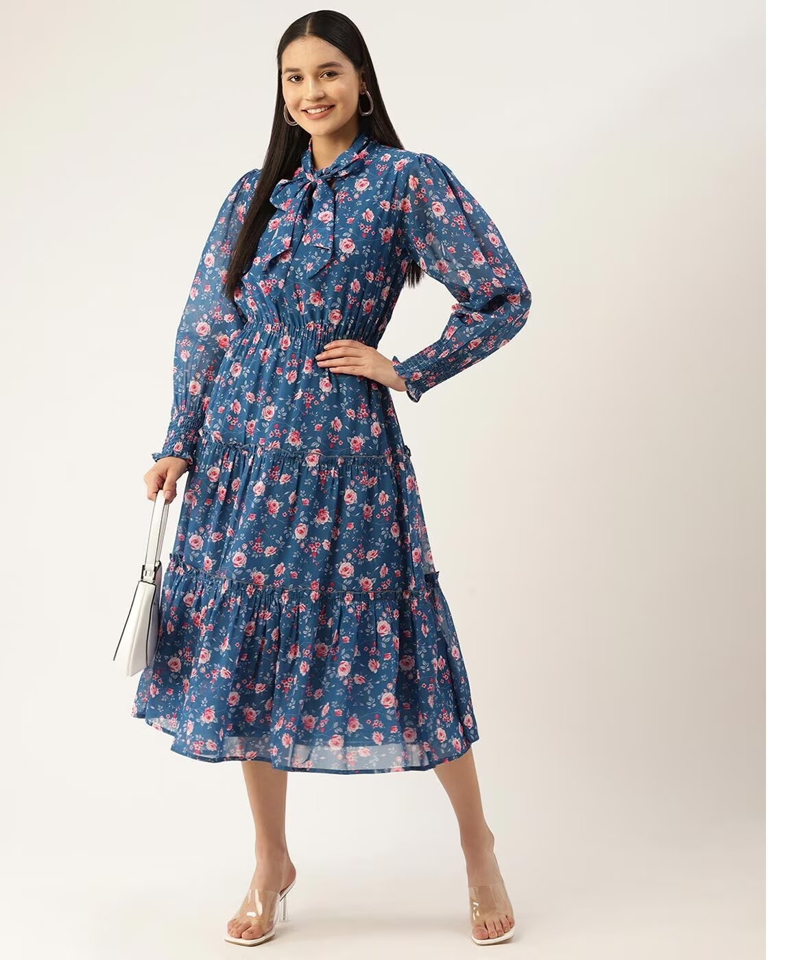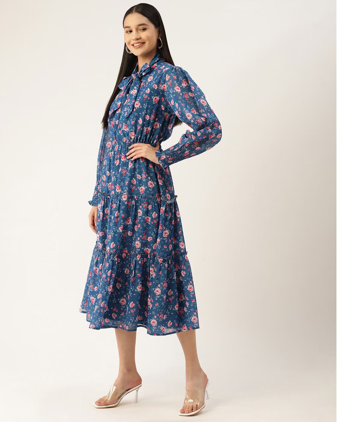 Blue Floral Printed Smocked Detailed Tiered Georgette Fit & Flare Dress