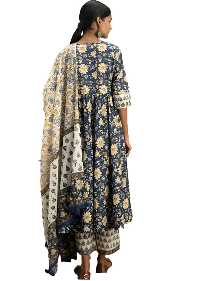 Blue Printed Cotton Anarkali Kurta With Palazzos & Dupatta in Berlin