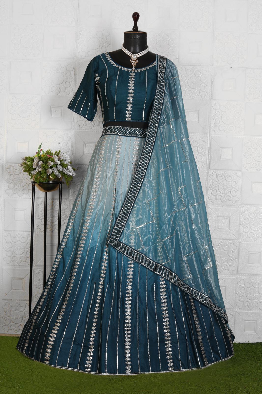 Blue colored lehenga is prettified with thread, sequins and floral work as shown which makes it appear classy. This lehenga is made of satin fabric which is accompanied with satin blouse, crepe lining with can-can and netted dupatta. Women can buy this lehenga to wear for their parties, functions and events.