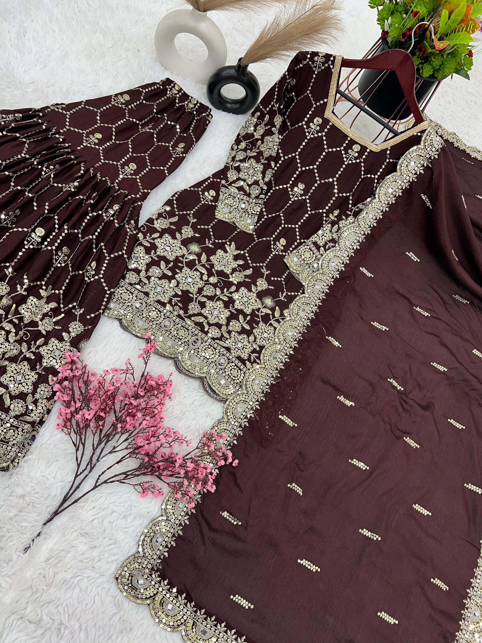 Sharara Fabrics :Pure Heavy Chinnon Silk With Embrodary Siquance Work With Real Mirror Hand Work