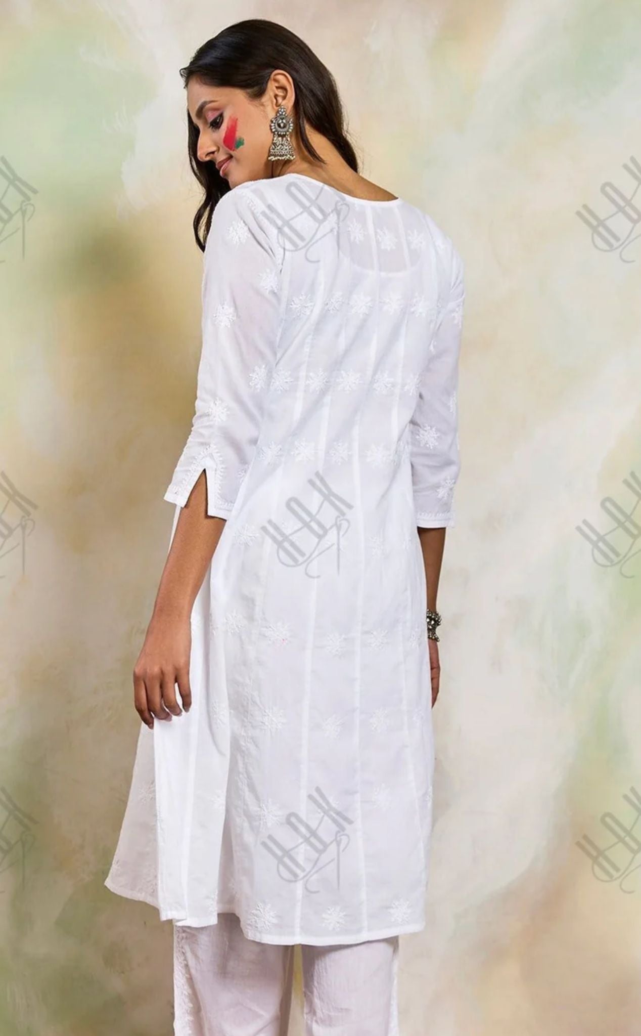 Women Notch Neck Floral Embroidered Chikankari Shadow Work Cotton Kurta