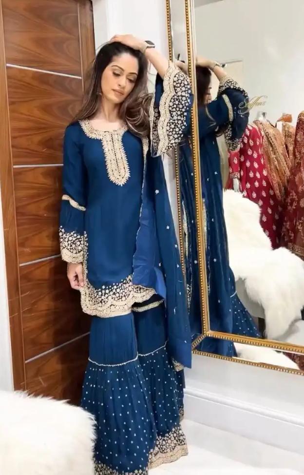 Top :Pure Heavy Chinnon Silk With Heavy Embroidery Sequence Work with Diamond Hand Work With Lace Work and Full SleeveInner : Heavy Micro Cotton Length-46 InchPent : Pure Heavy Chinnon Silk With Embrodary Sequence Work
