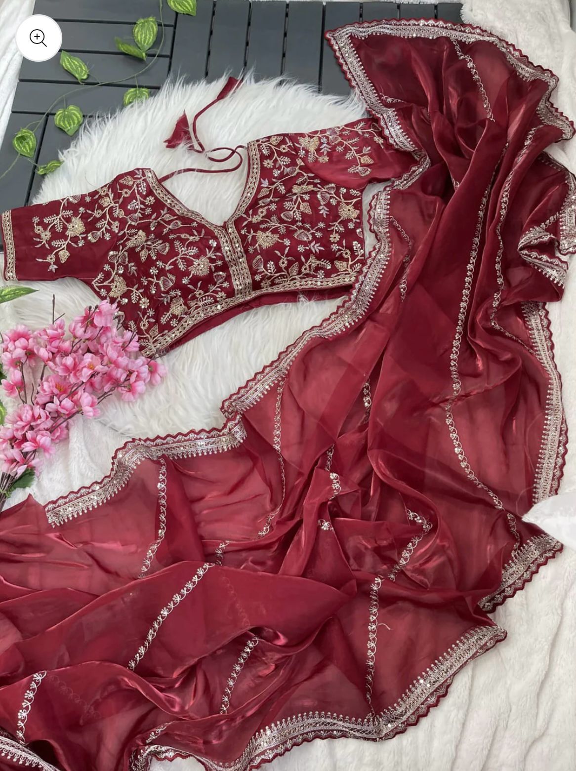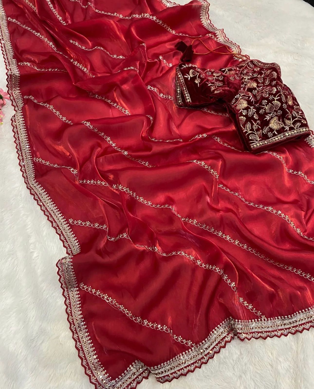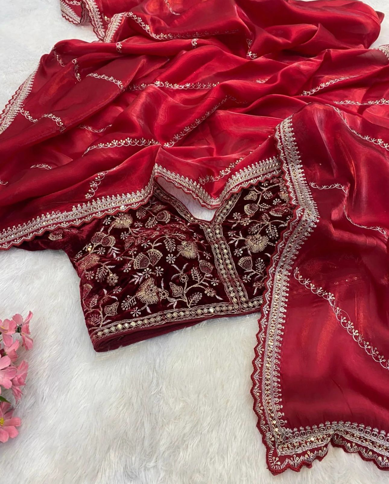 Jimmy Choo Organza Saree with Embroidered Stitched blouse(Red)