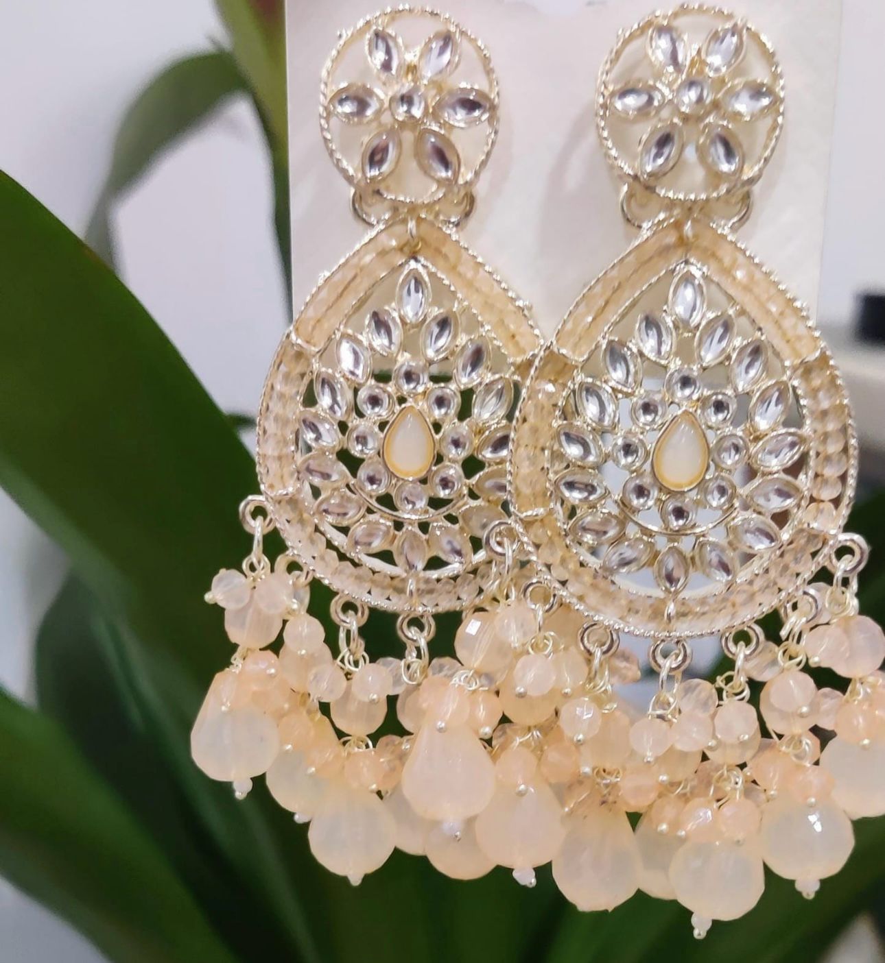 Gold-toned, white & contemporary chandbalis, gold-plated, has artificial beads & stones