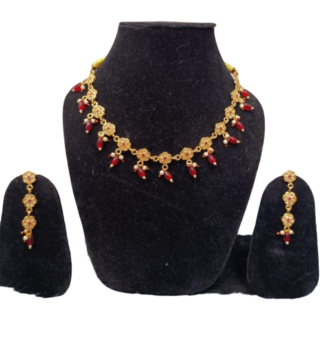 Red Gold-Plated Stone-Studded Necklace & Earrings Set
