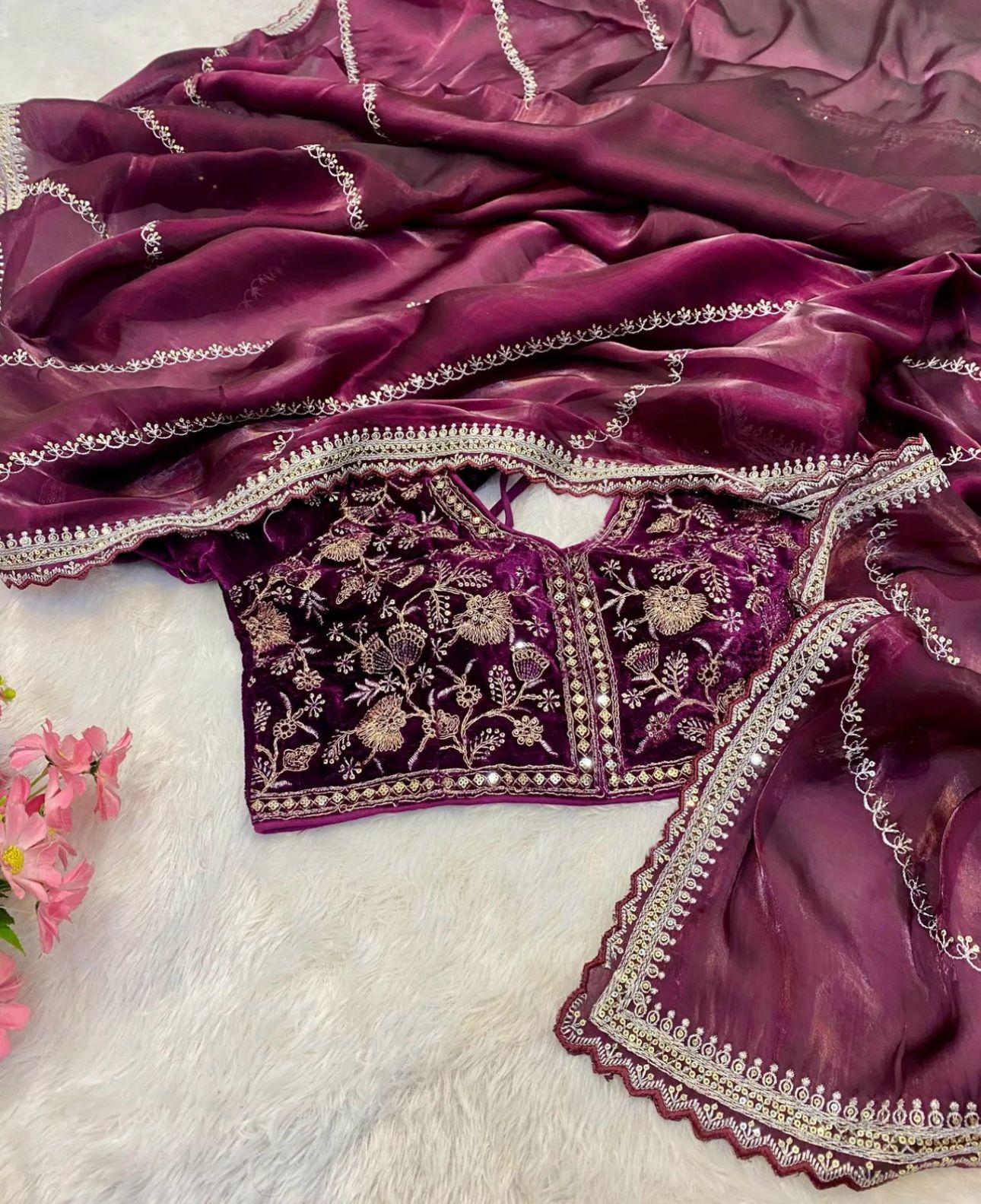 Jimmy Choo Organza Saree with Embroidered Stitched blouse(Purple)