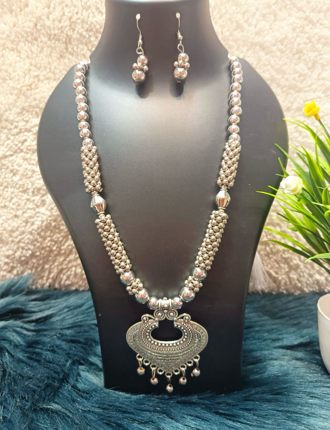 Silver-Plated Stone-Beaded Oxidized Necklace & Earrings Set