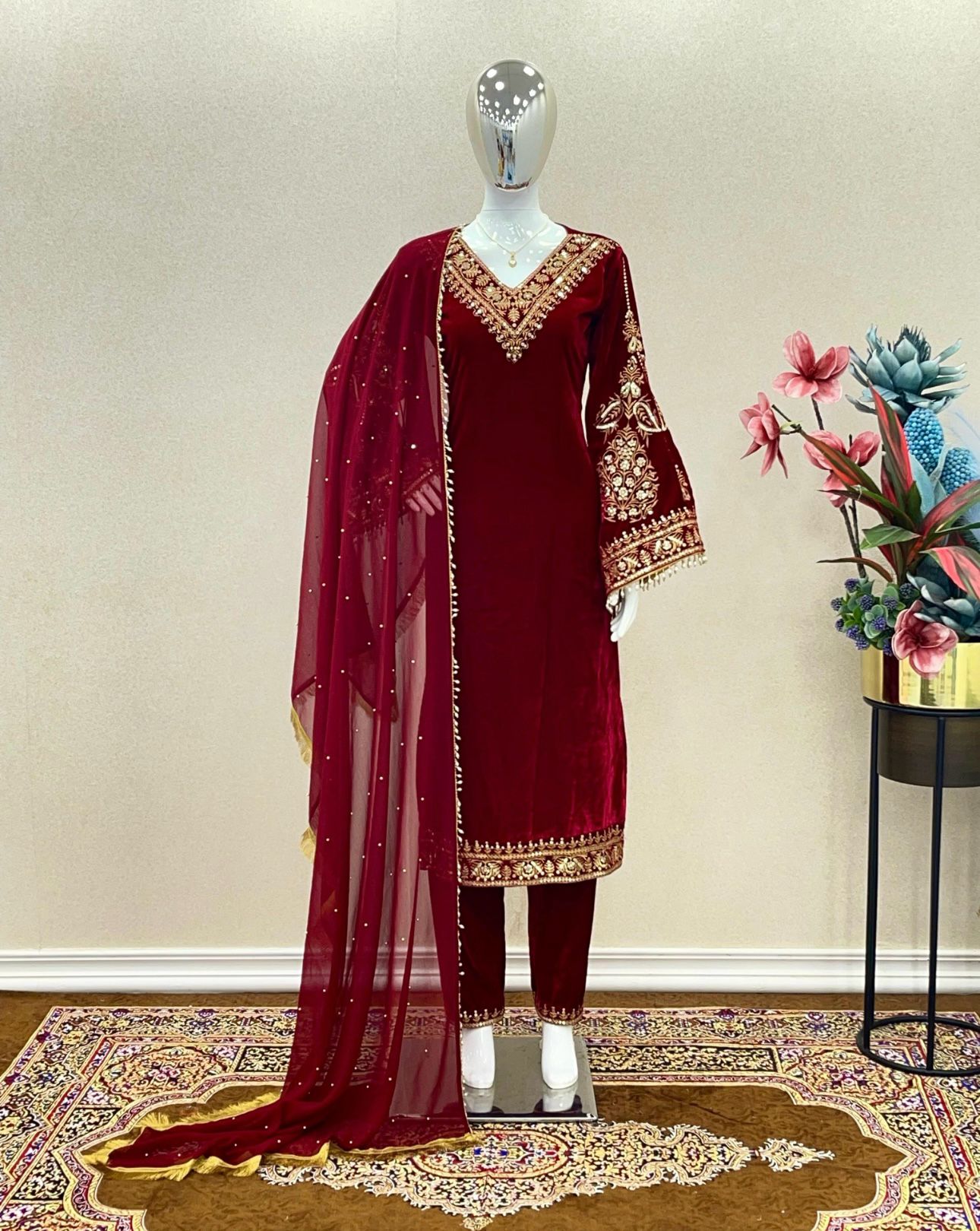 👉🧚‍♀️ Top Fabric:Heavy Pure Viscose Velvet With Embroidery 5 mm Sequence Work With Fancy Bell Sleeve & Fancy Moti Latkan