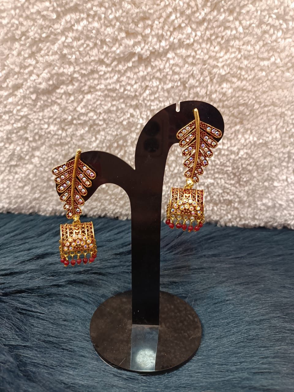 Gold-toned and red circular Jali Style drop earrings, gold-plated, have artificial stones
