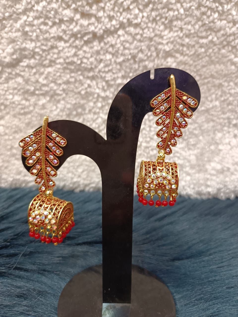 Gold-toned and red circular Jali Style drop earrings, gold-plated, have artificial stones