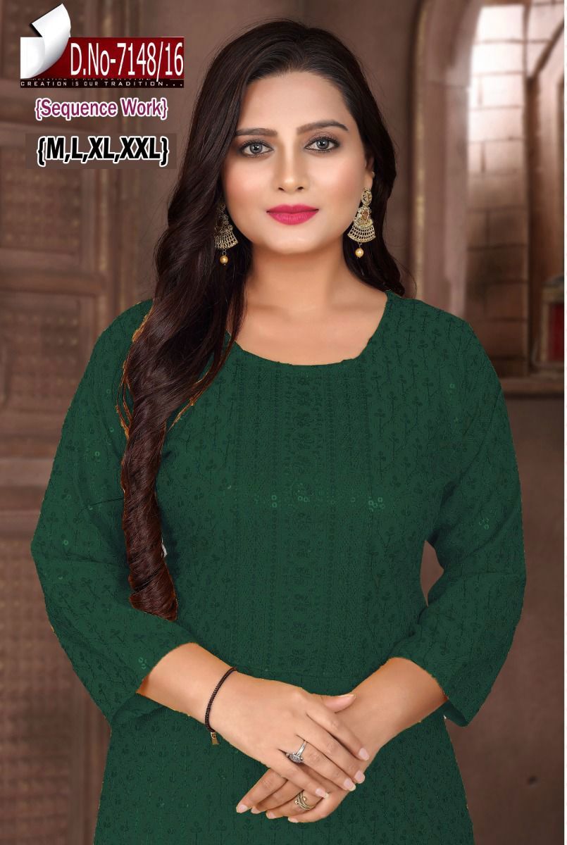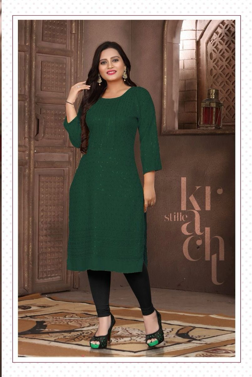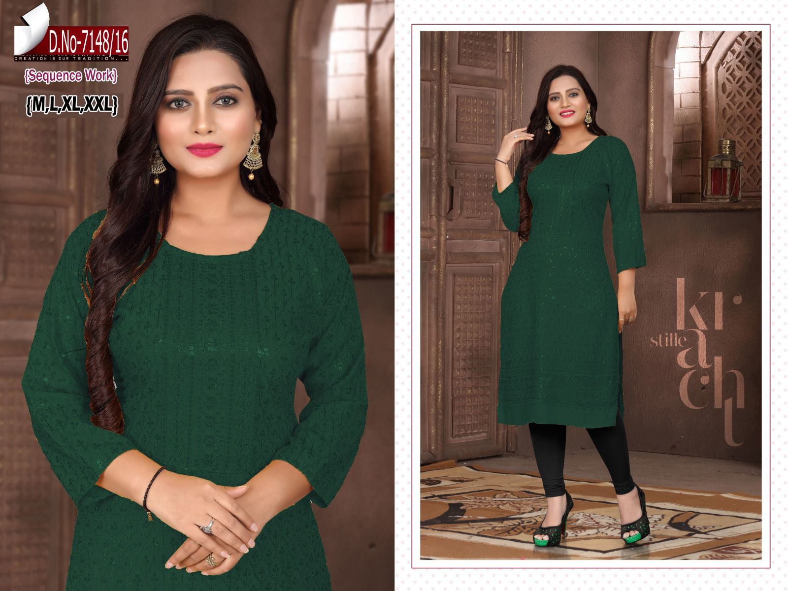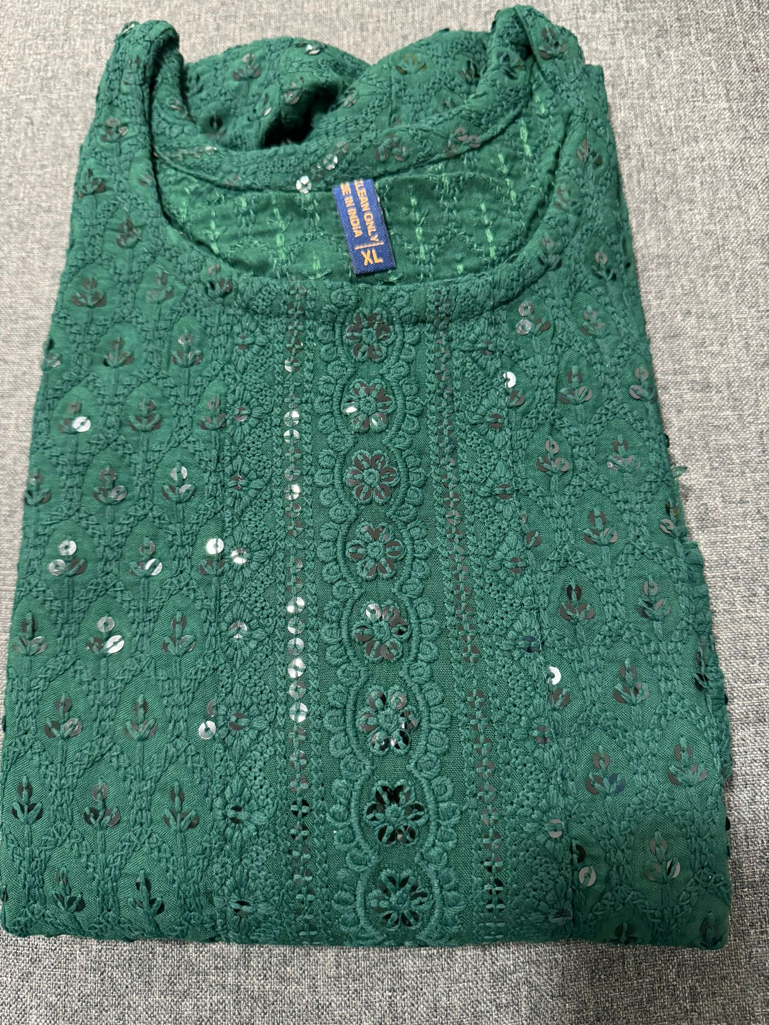 Women Bottle Green Embroidered with Sequence Chikankari Straight Kurta