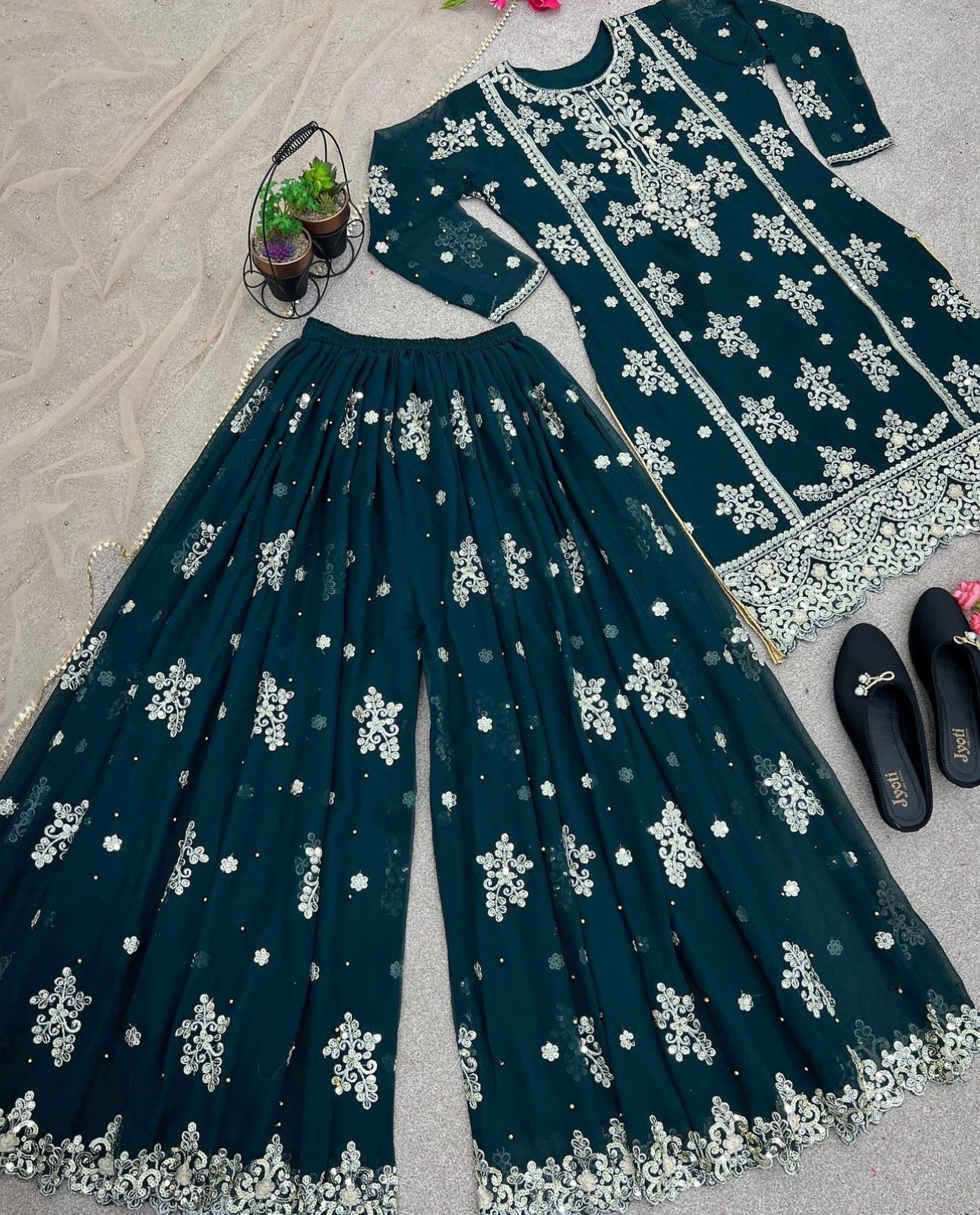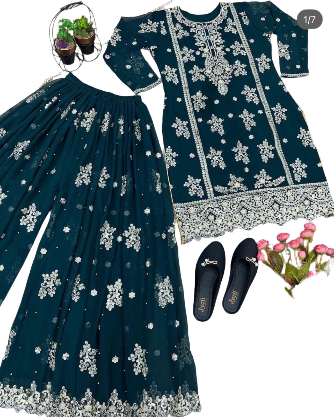 Plazzo Fabrics :Heavy Faux Georgette With 5mm Embroidery Sequence And Revet Moti Work With Fully Flair