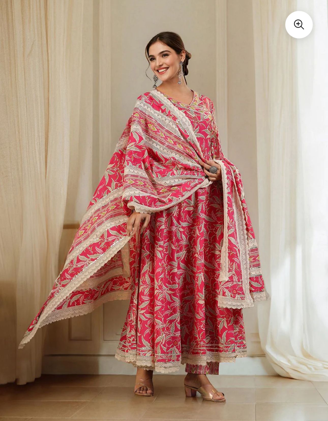 Graceful Cotton Pink Floral Printed Angrakha Kurta With Straight Bottom And Cotton Printed Dupatta