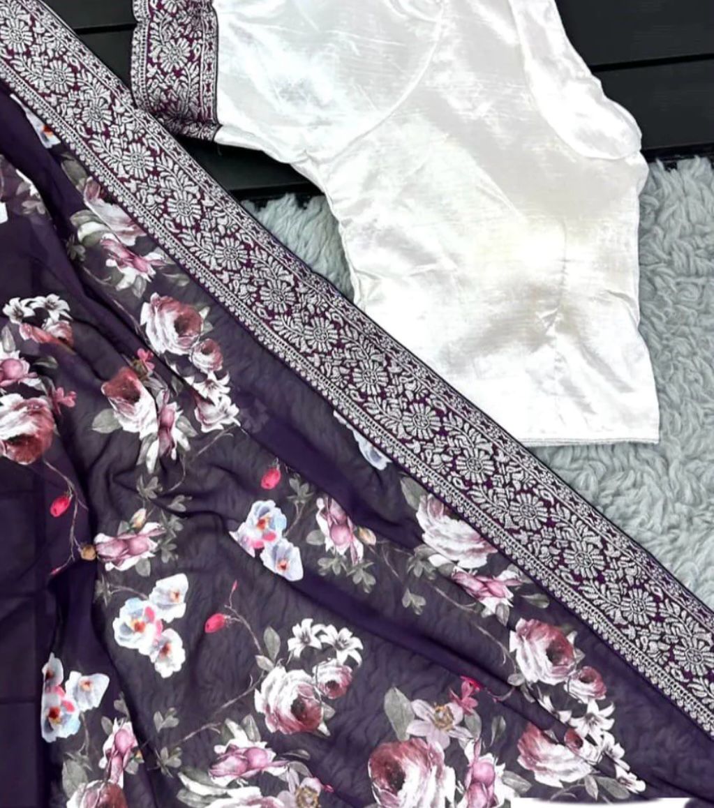 Premium quality georgette saree with allover beautiful Flowers prints along with Contract Weaving Attached Border.