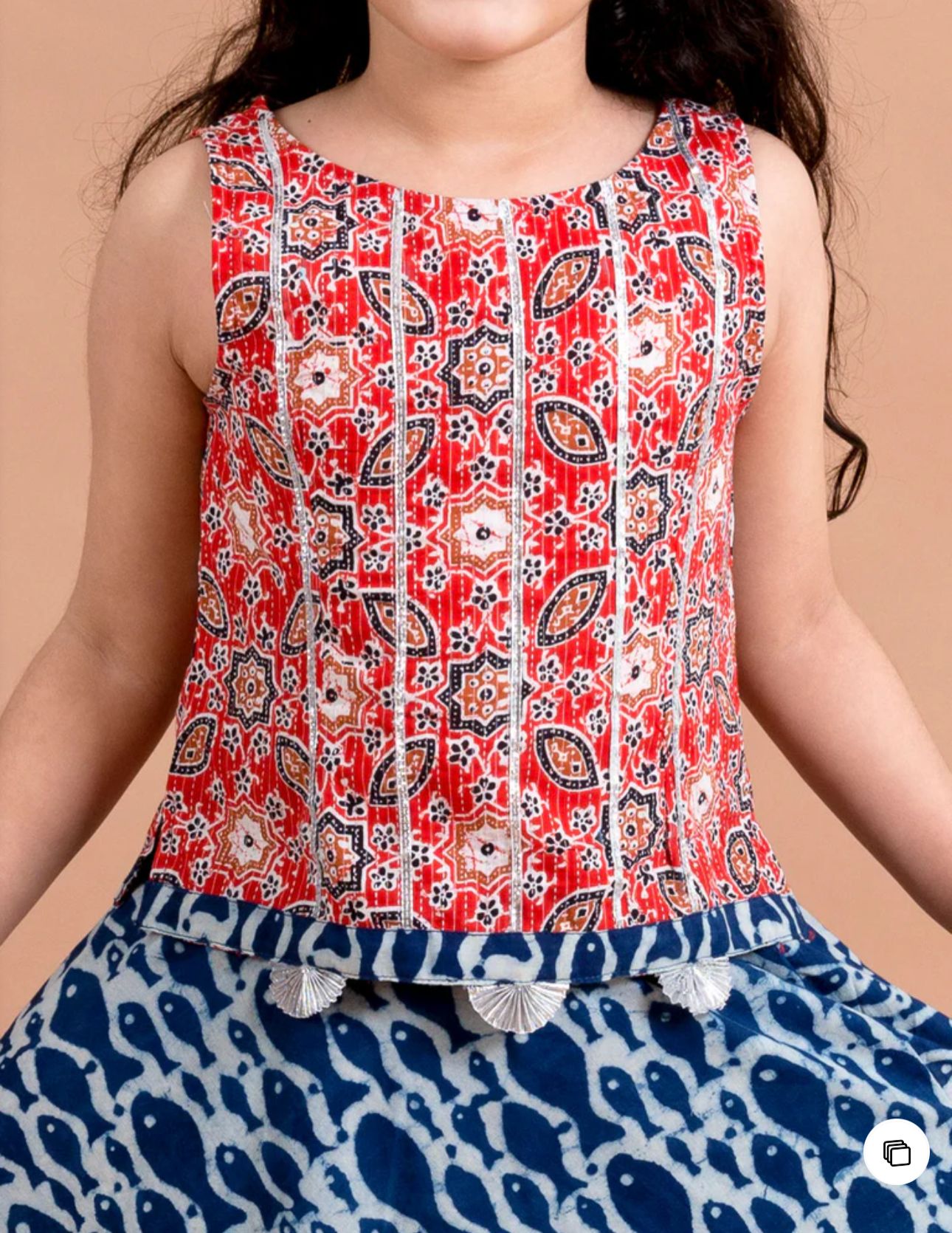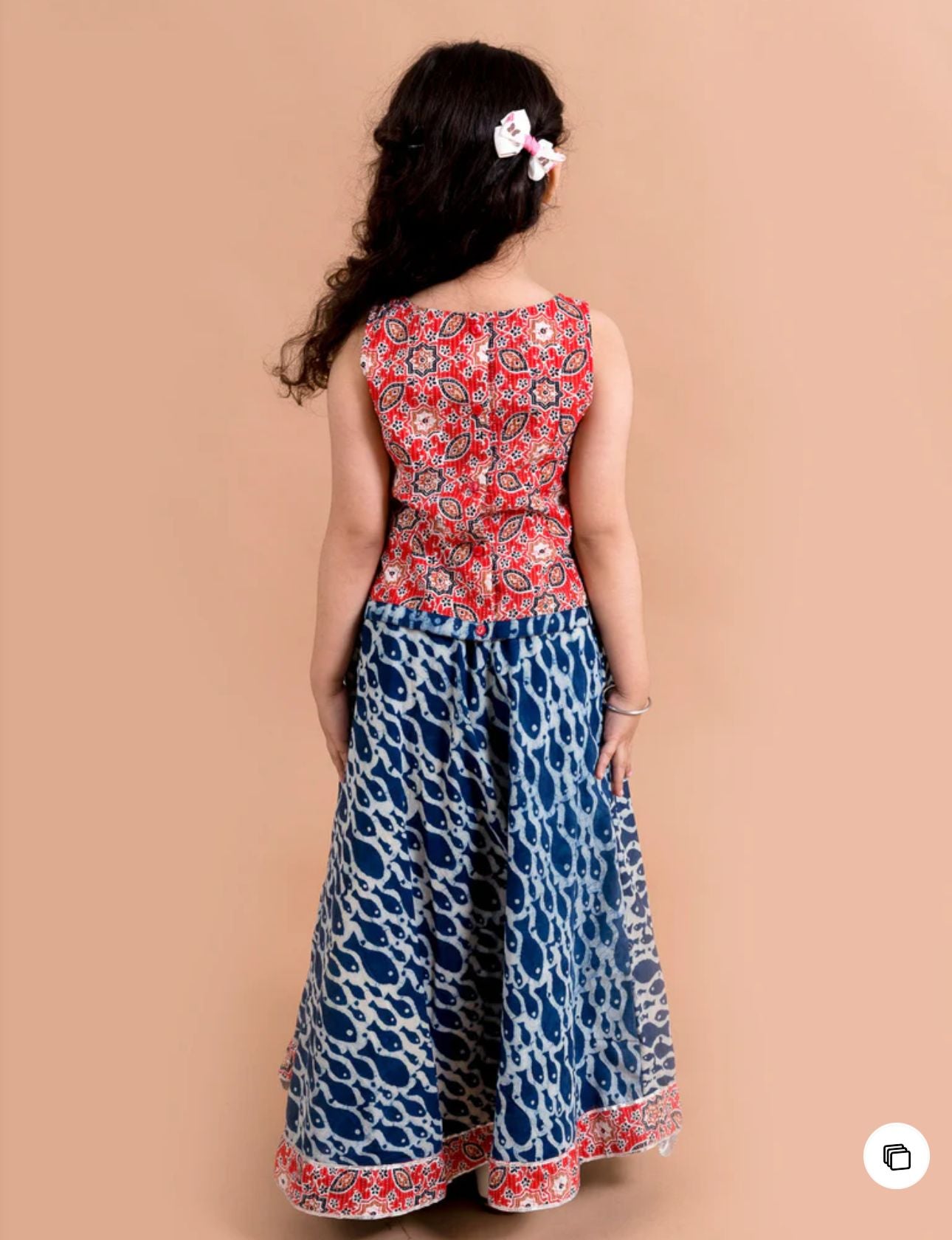 Girls Blue & Red Printed Ready to Wear Lehenga & Choli