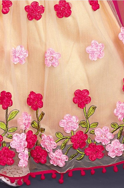 Beige, pink and red embroidered ready to wear lehenga, has slip-on closure, flared hem