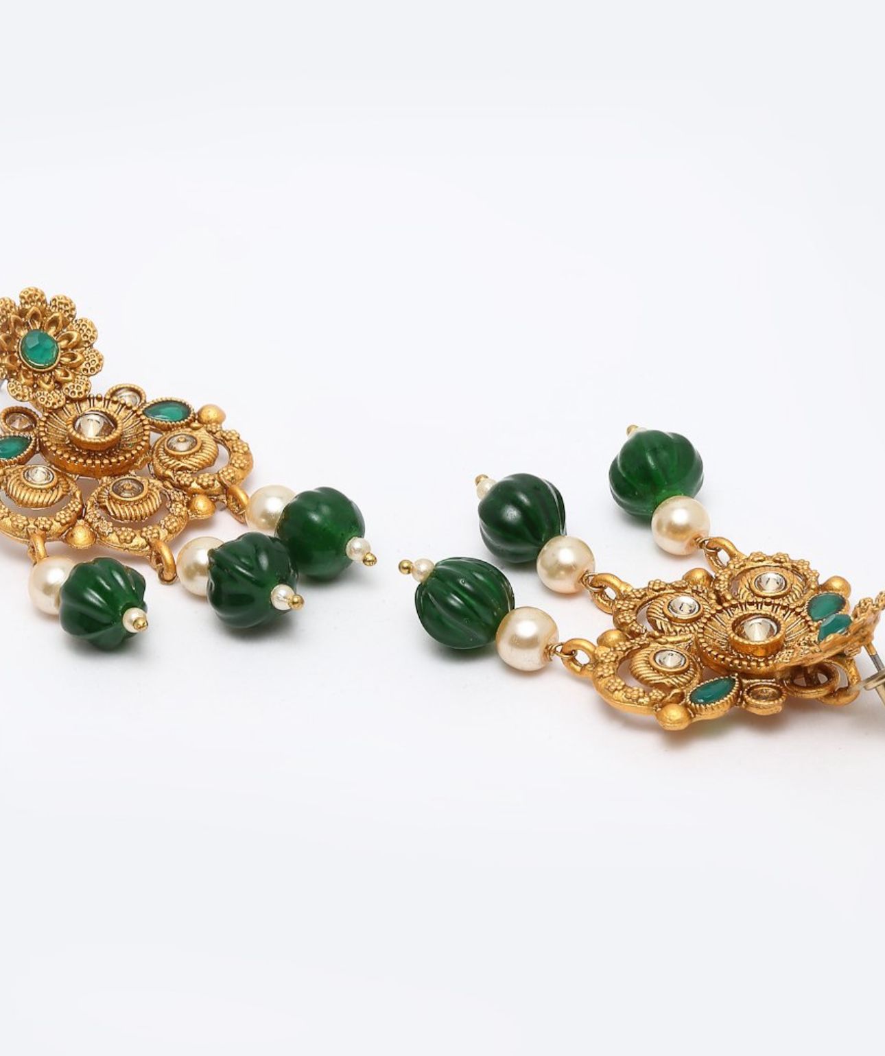 Gold-Plated Green & White Stone-Studded & Pearl-Beaded Jewellery Set