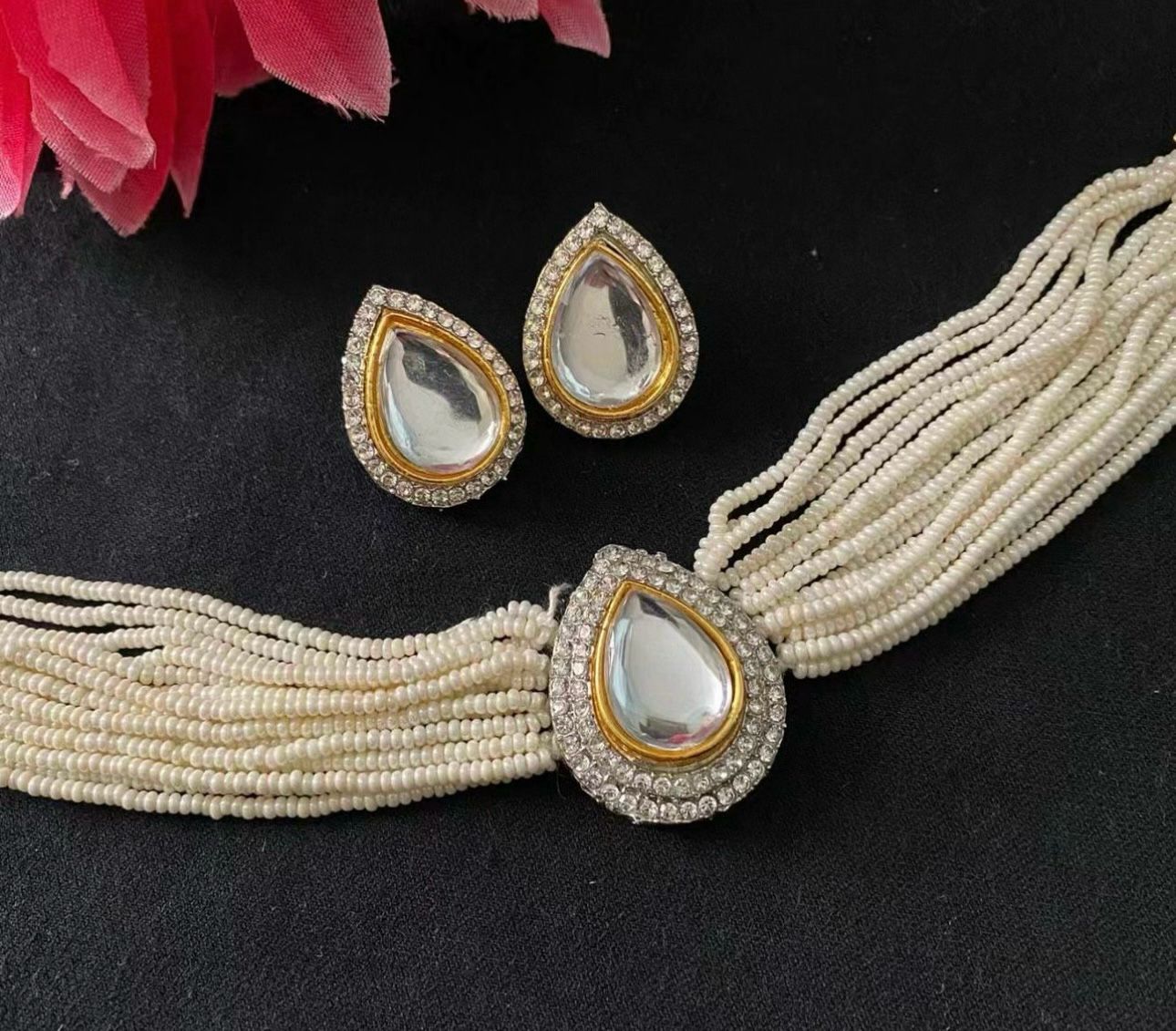 Gold-Plated Kundan & Pearl Studded Choker Necklace with Earrings