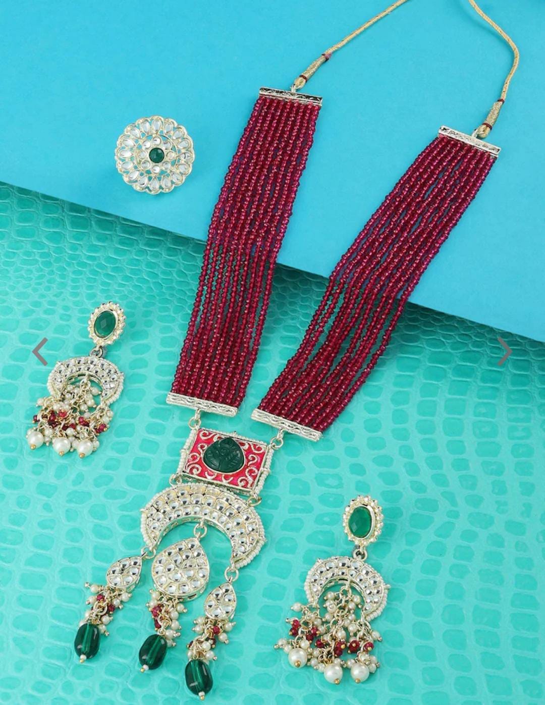 Gold Plated Pink & Green Stone-Studded & Pearl Beaded Jewellery Set