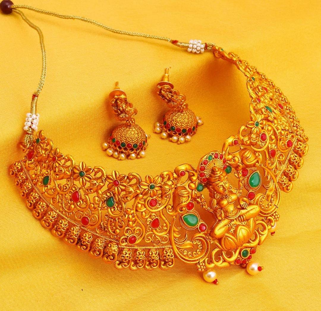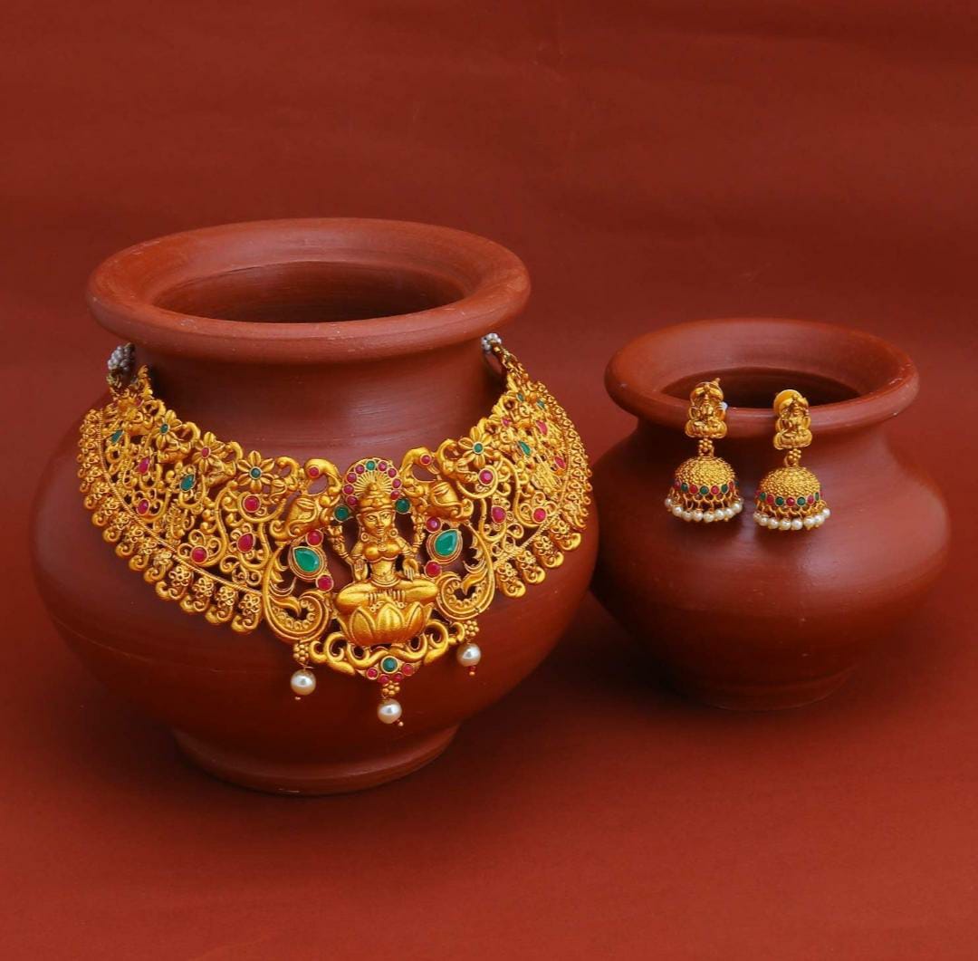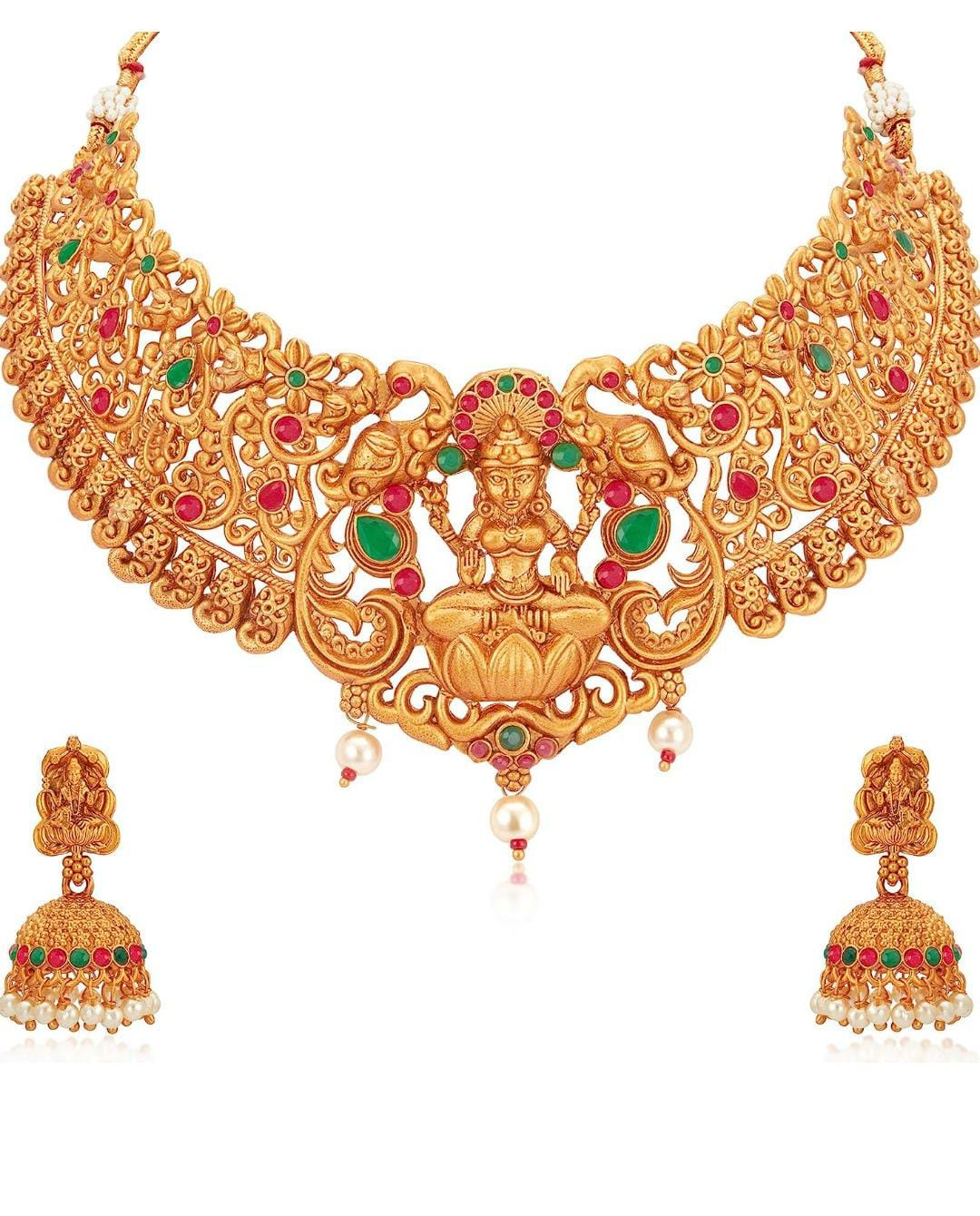 Gold Plated Temple Jewellery Goddess Laxmi Choker Necklace Set for Women
