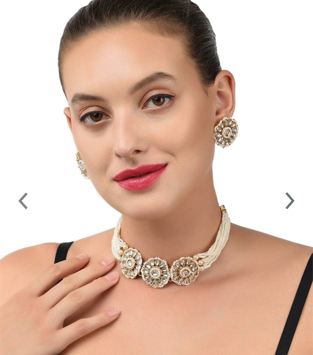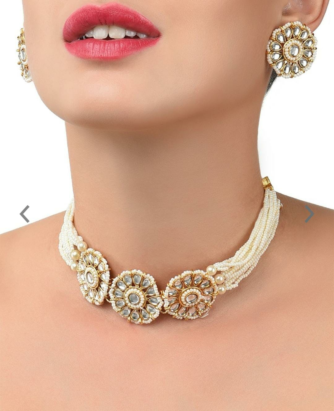 Gold Plated & White Kundan & Pearls Multistrand Choker Jewellery Set
