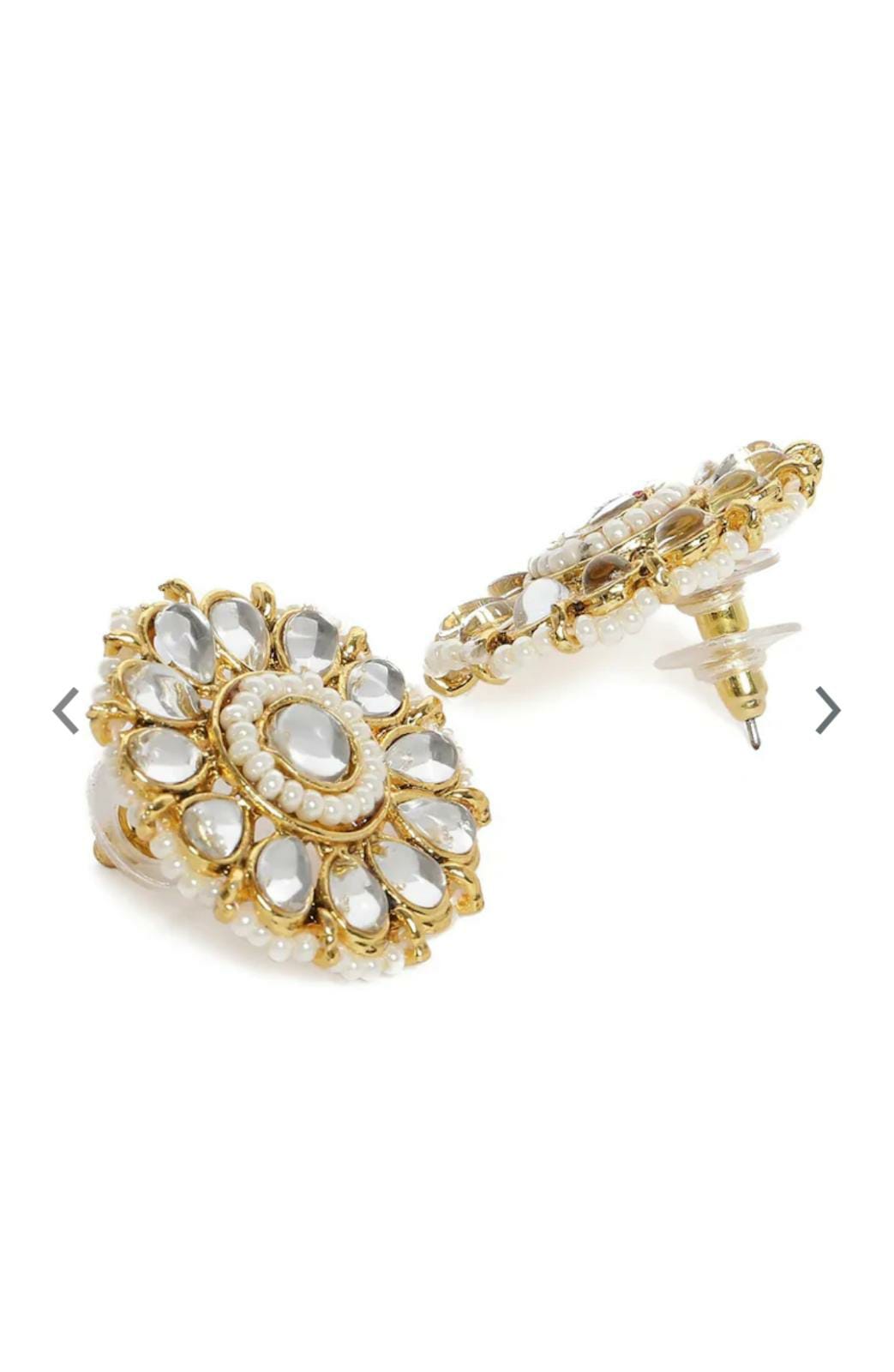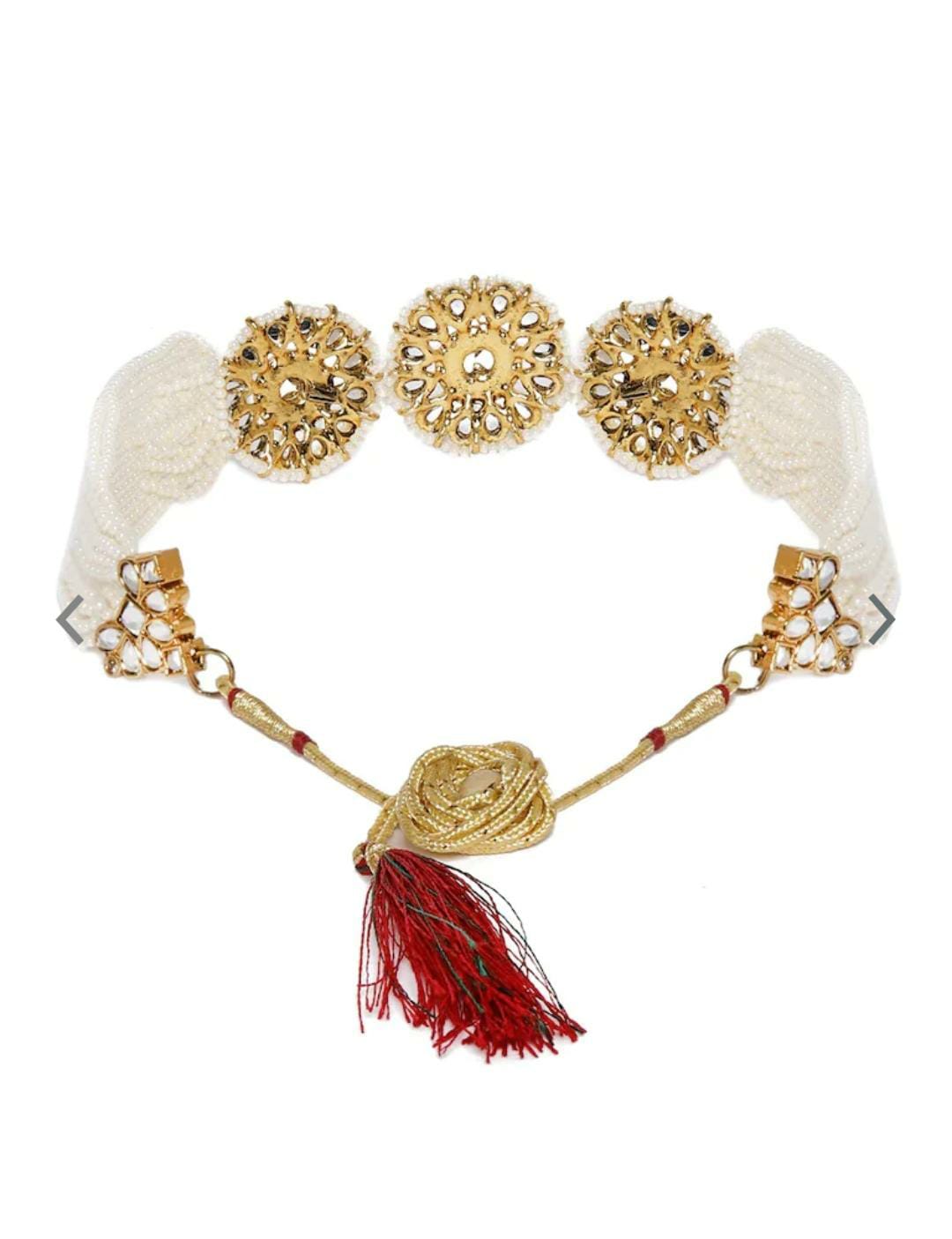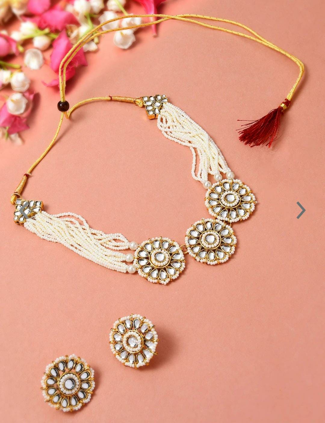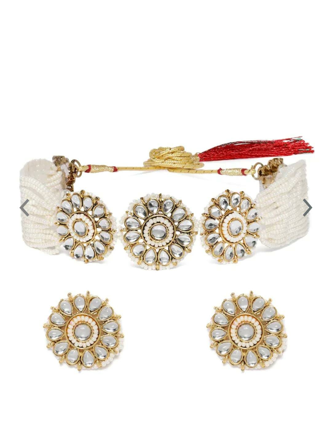 Gold Plated & White Kundan & Pearls Studded Multistrand Choker Jewellery Set