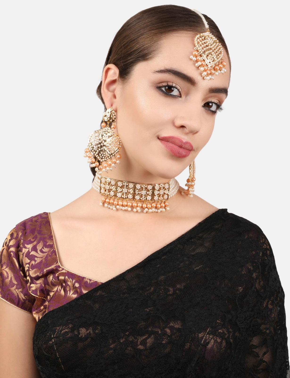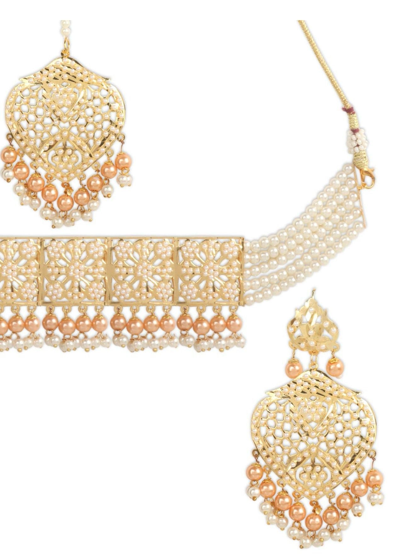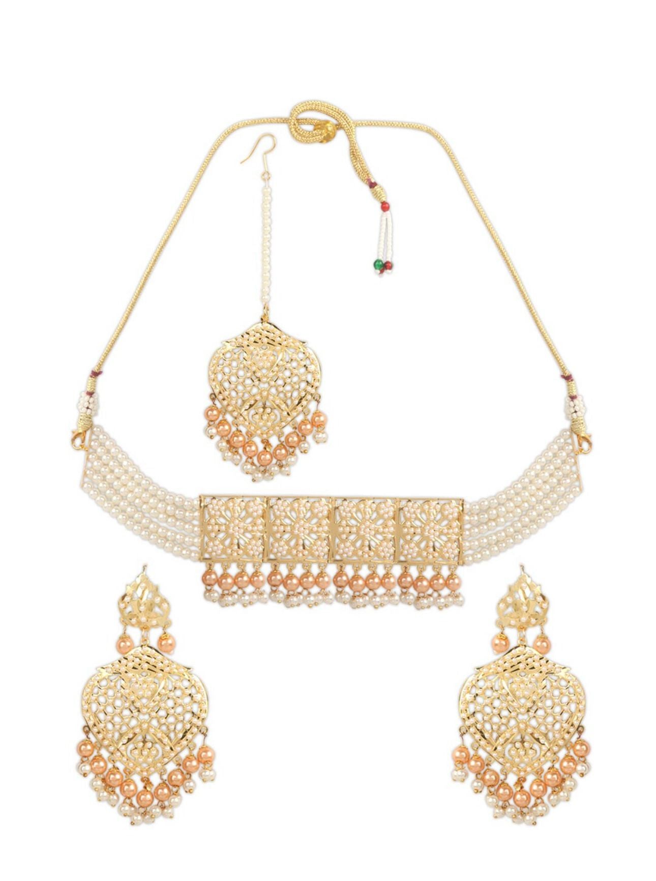 Gold-plated white and peach-coloured pearl beaded choker necklace, has polki and cutwork design detail
