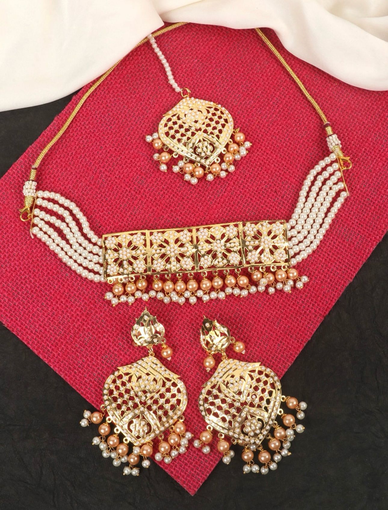 This jewellery set consists of a necklace, a pair of earrings and maang tikka