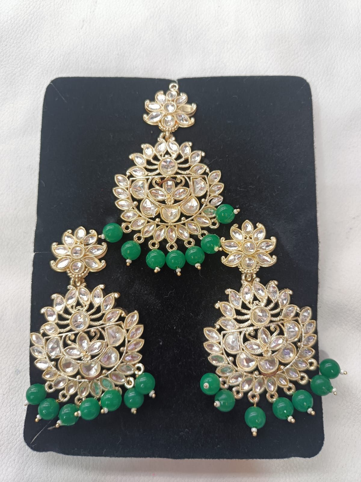 Green Gold Plated Pearl and Kundan Maang Tikka with Earrings for Women