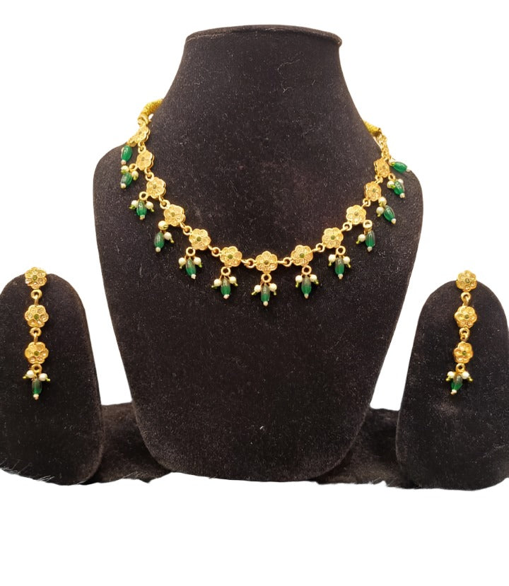 Green Gold-Plated Stone-Studded Necklace & Earrings